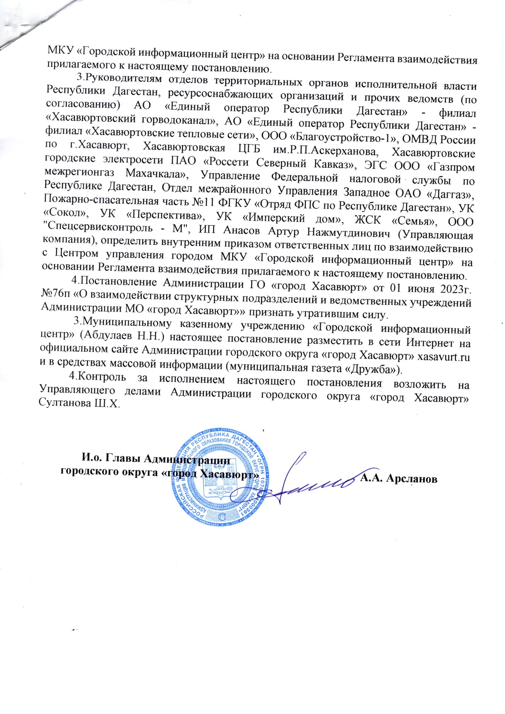 Постановление № 76п от 01 июня 2023 г. О взаимодействии структурных подразделений и ведомственных учреждений Администрации МО «город Хасавюрт»