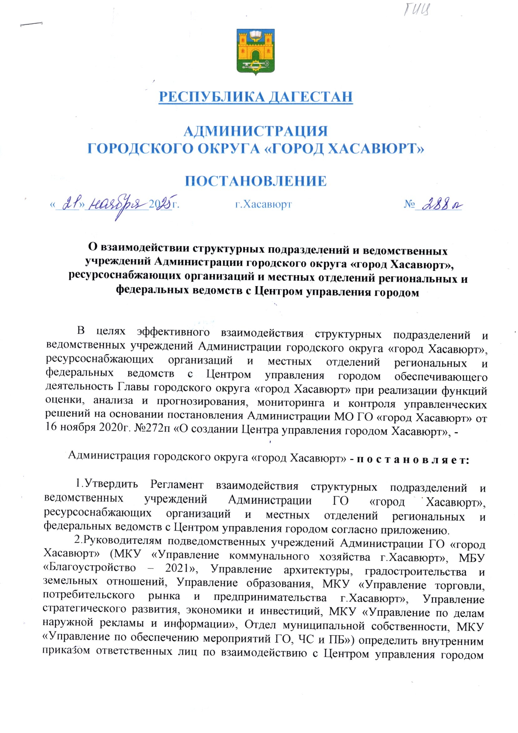 Постановление от 21 ноября 2025 г. № 288 п О взаимодействии структурных подразделений и ведомственных учреждений Администрации городского округа «город Хасавюрт», ресурсоснабжающих организаций и местных отделений региональных и федеральных ведомств с Центром управления городом