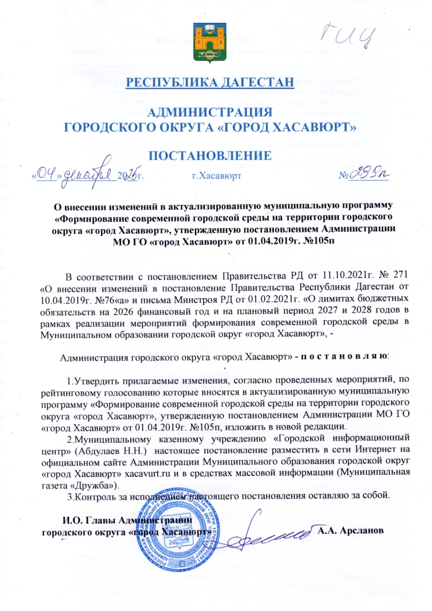Постановление от 4 декабря 2025 г. № 299 п О внесении изменений в актуализированную муниципальную программу "Формирование современной городской среды на территории городского округа "город Хасавюрт", утвержденную постановлением Администрации МО ГО "город Хасавюрт" от 01.04.2019г. №105п