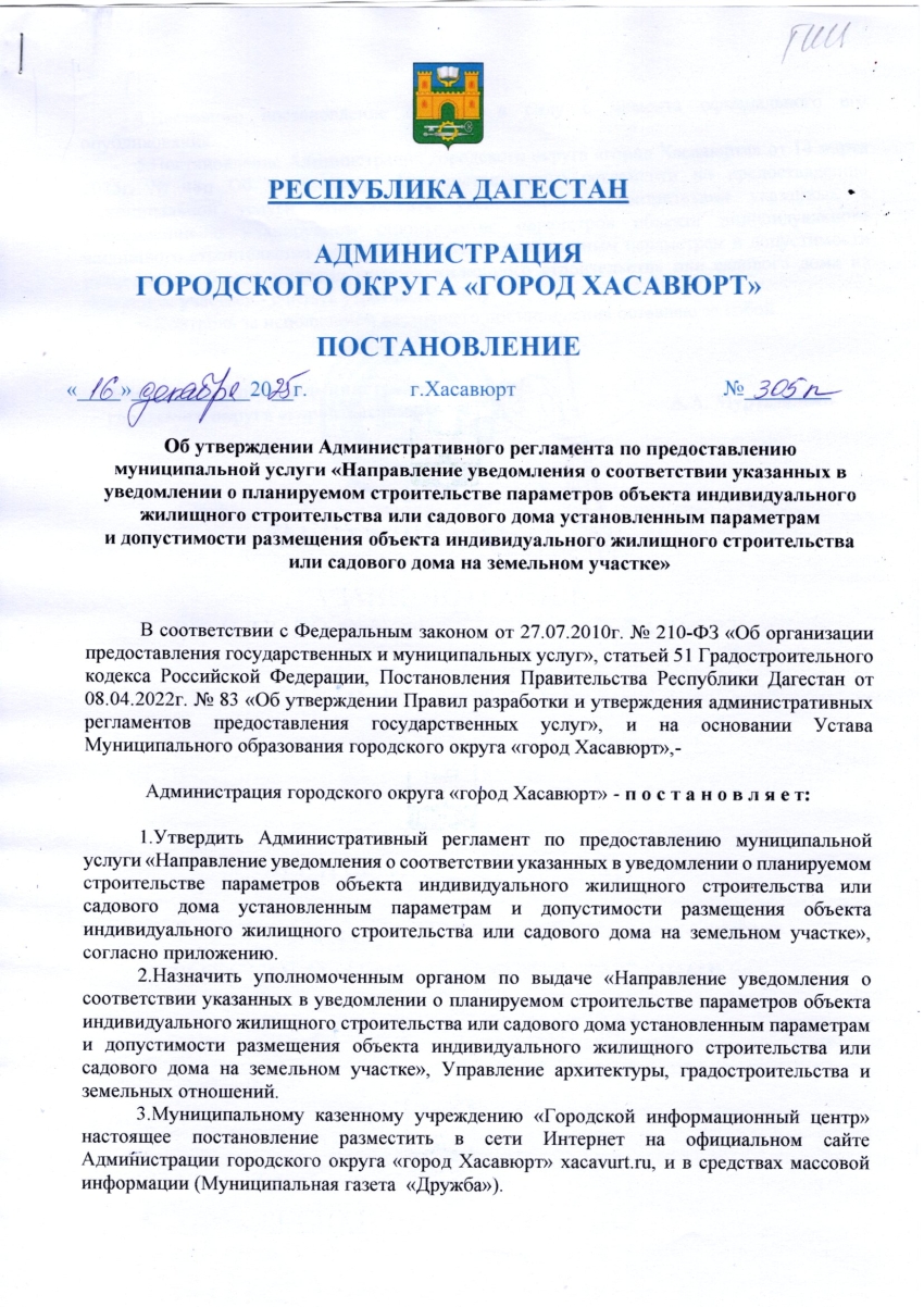 Постановление от 16 декабря 2025 г. № 305п Об утверждении Административного регламента по предоставлению муниципальной услуги «Направление уведомления о соответствии указанных в уведомлении о планируемом строительстве параметров объекта индивидуального жилищного строительства или садового дома установленным параметрам и допустимости размещения объекта индивидуального жилищного строительства или садового дома на земельном участке»