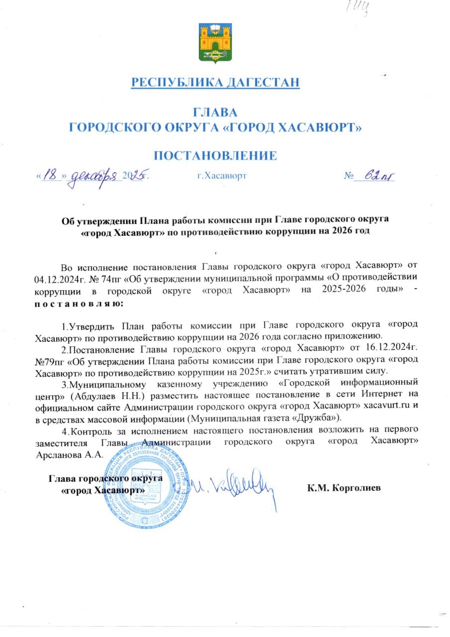Постановление от 18 декабря 2025 г. № 62пг Об утверждении Плана работы комиссии при Главе городского округа "город Хасавюрт" по противодействию коррупции на 2026 год