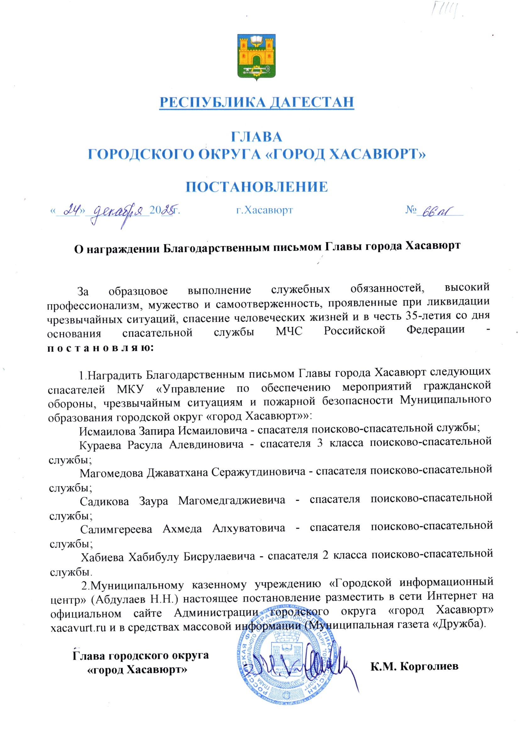 Постановление от 24 декабря 2025 г. № 66пг О награждении Благодарственным письмом Главы города Хасавюрт