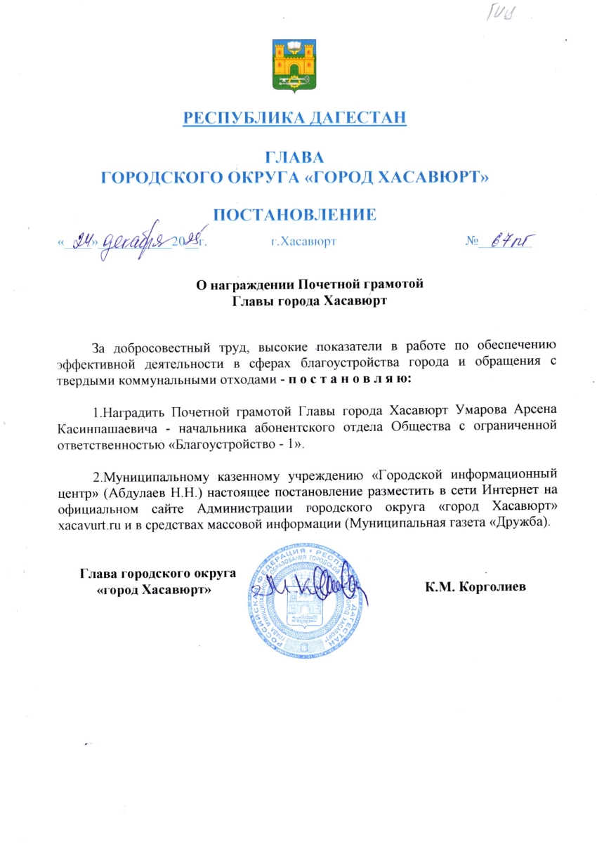 Постановление от 24 декабря 2025 г. № 67 пг О награждении Благодарственным письмом Главы города Хасавюрт