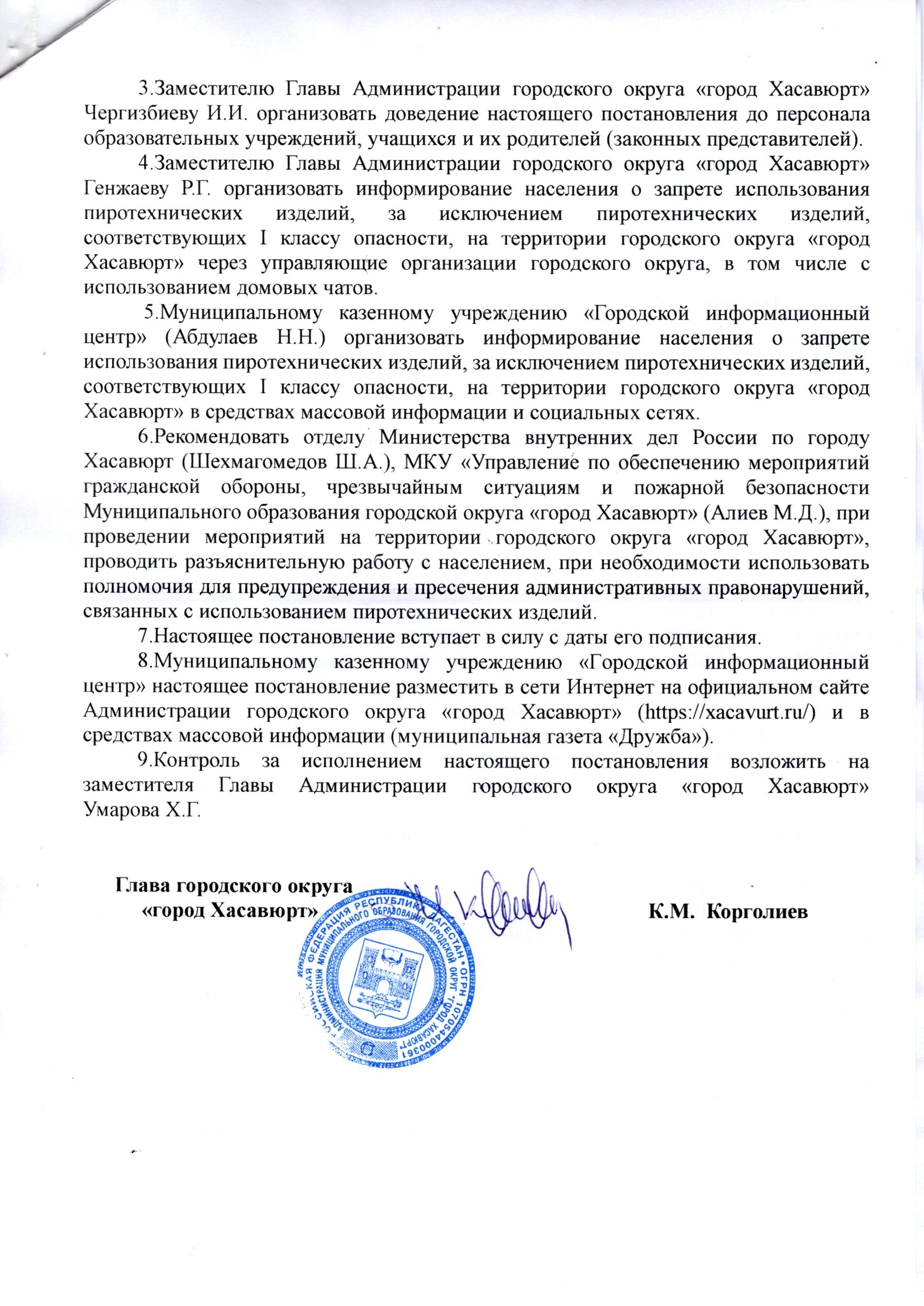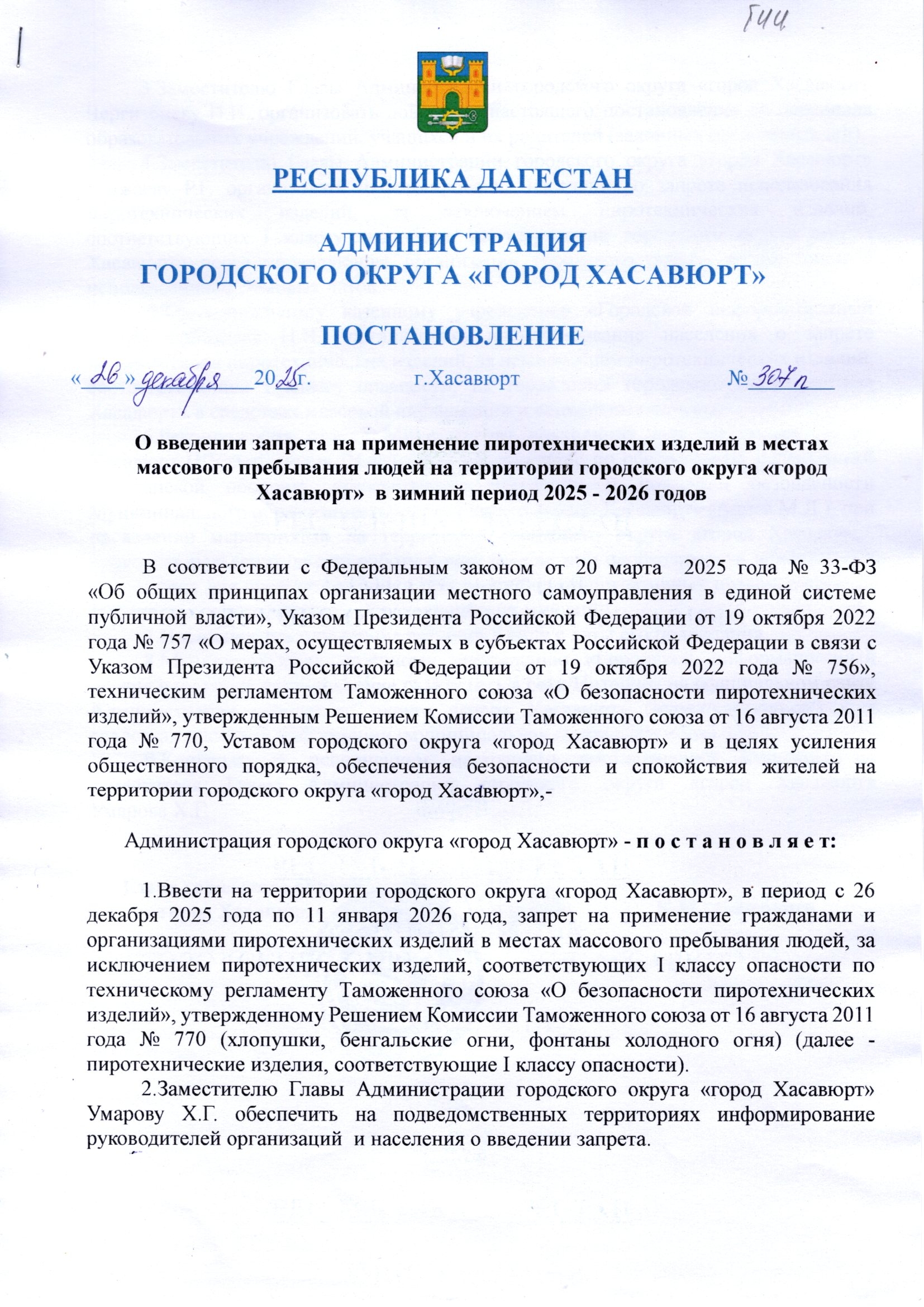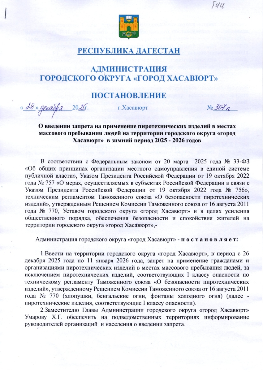 Постановление от 26 декабря 2025 г. № 307 п О введении запрета на применение пиротехнических изделий в местах массового пребывания людей на территории городского округа "город Хасавюрт" в зимний период 2025 - 2026 годов