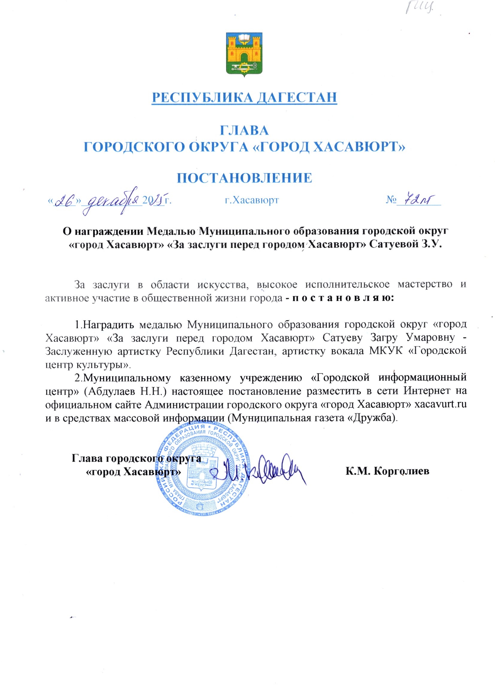 Постановление от 26 декабря 2025 г. № 72 пг О награждении Медалью Муниципального образования городской округ "город Хасавюрт" "За заслуги перед городом Хасавюрт" Сатуевой З.У.