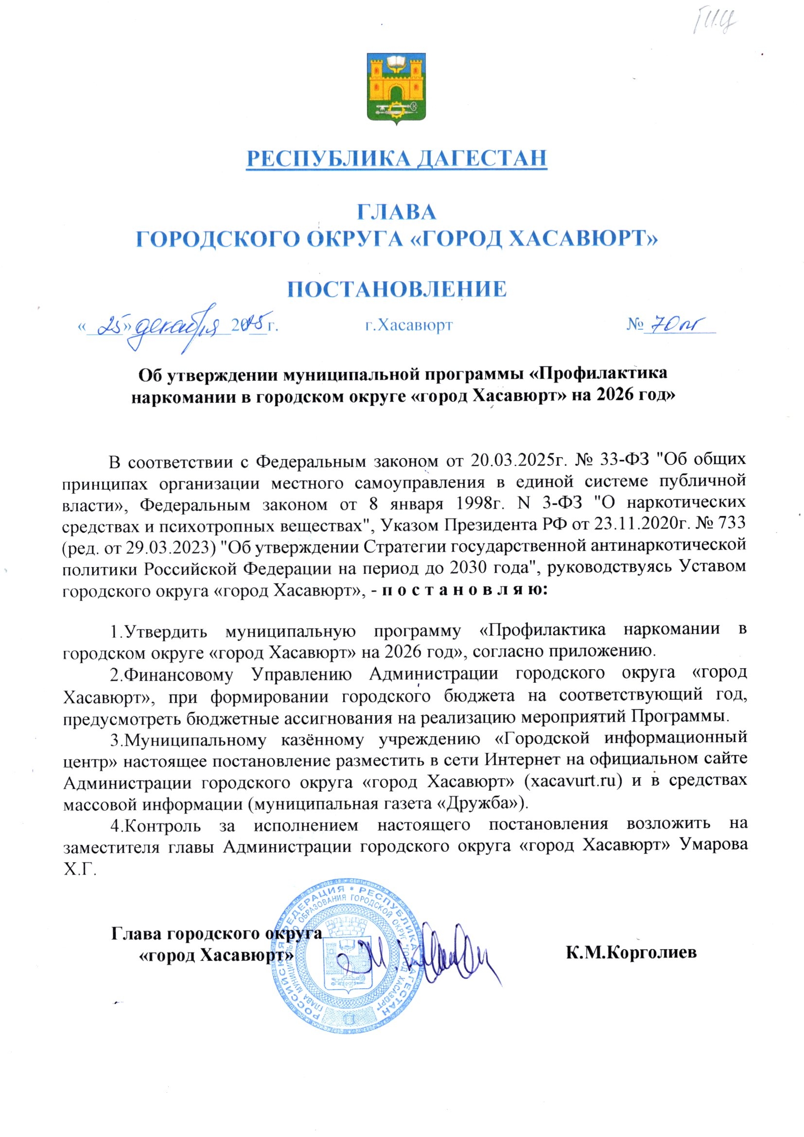 Постановление от 25 декабря 2025 г. № 70 пг Об утверждении муниципальной программы "Профилактика наркомании в городском округе "город Хасавюрт" на 2026 год"