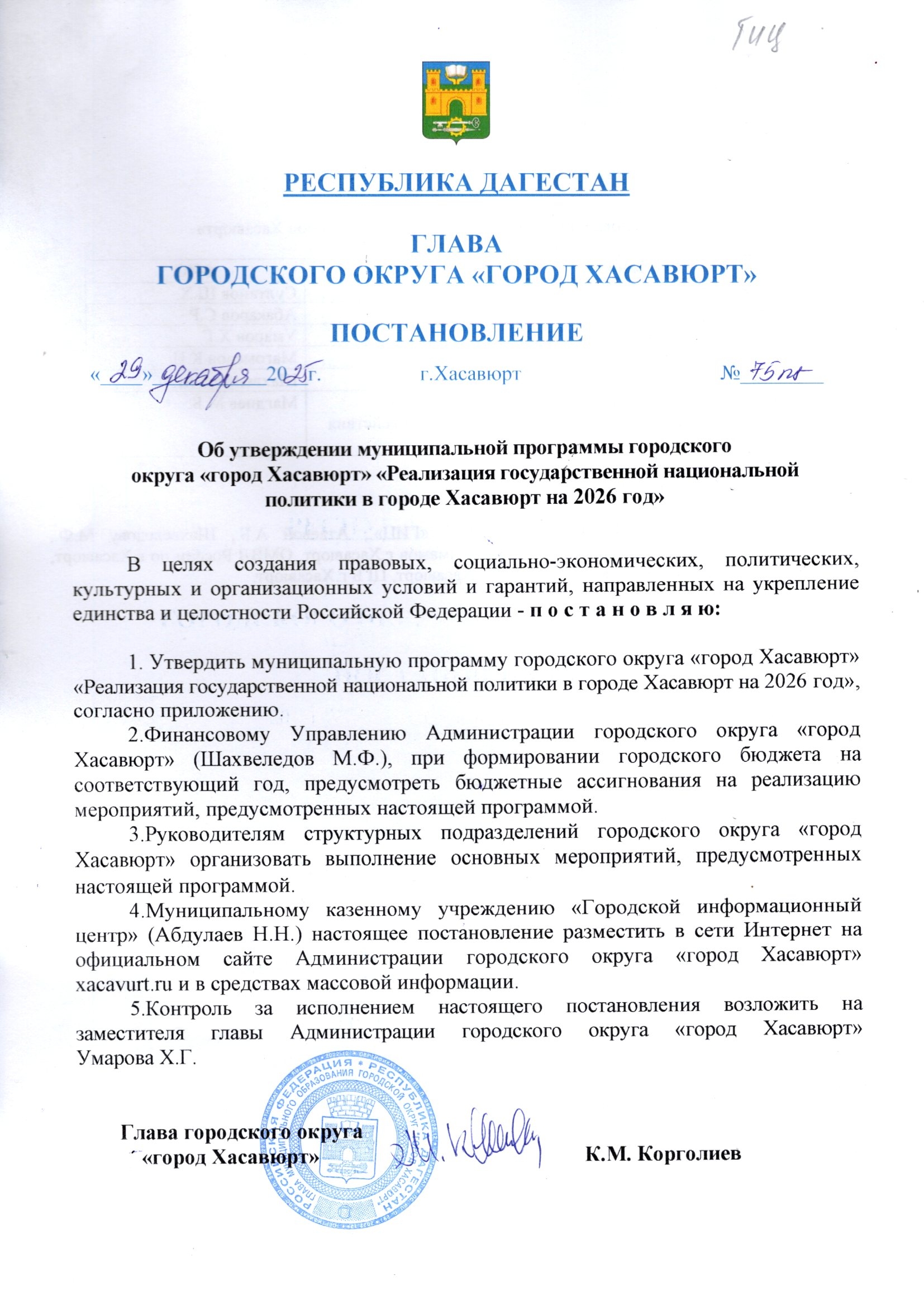 Постановление от 29 декабря 2025 г. № 75 пг Об утверждении муниципальной программы городского округа «город Хасавюрт» «Реализация государственной национальной политики в городе Хасавюрт на 2026 год»