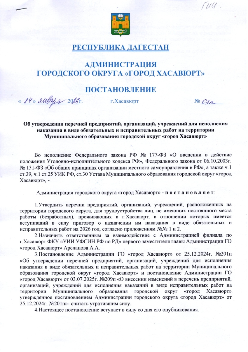 Постановление от 14 января 2026 г. № 03 п Об утверждении перечней предприятий, организаций, учреждений для исполнения наказания в виде обязательных и исправительных работ на территории Муниципального образования городской округ «город Хасавюрт»