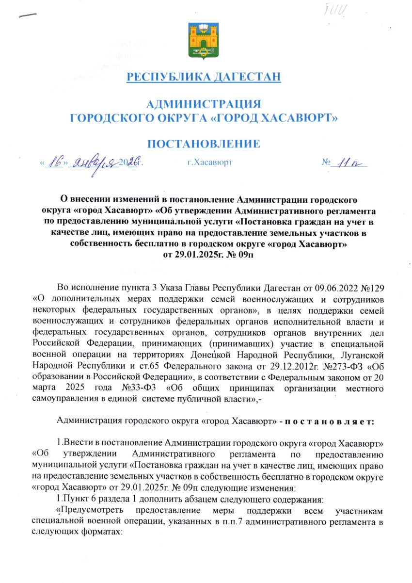 Постановление от 16 января 2026 г. № 11 О внесении изменений в постановление Администрации городского округа «город Хасавюрт» «Об утверждении Административного регламента по предоставлению муниципальной услуги «Постановка граждан на учет в качестве лиц, имеющих право на предоставление земельных участков в собственность бесплатно в городском округе «город Хасавюрт» от 29.01.2025г. № 09п