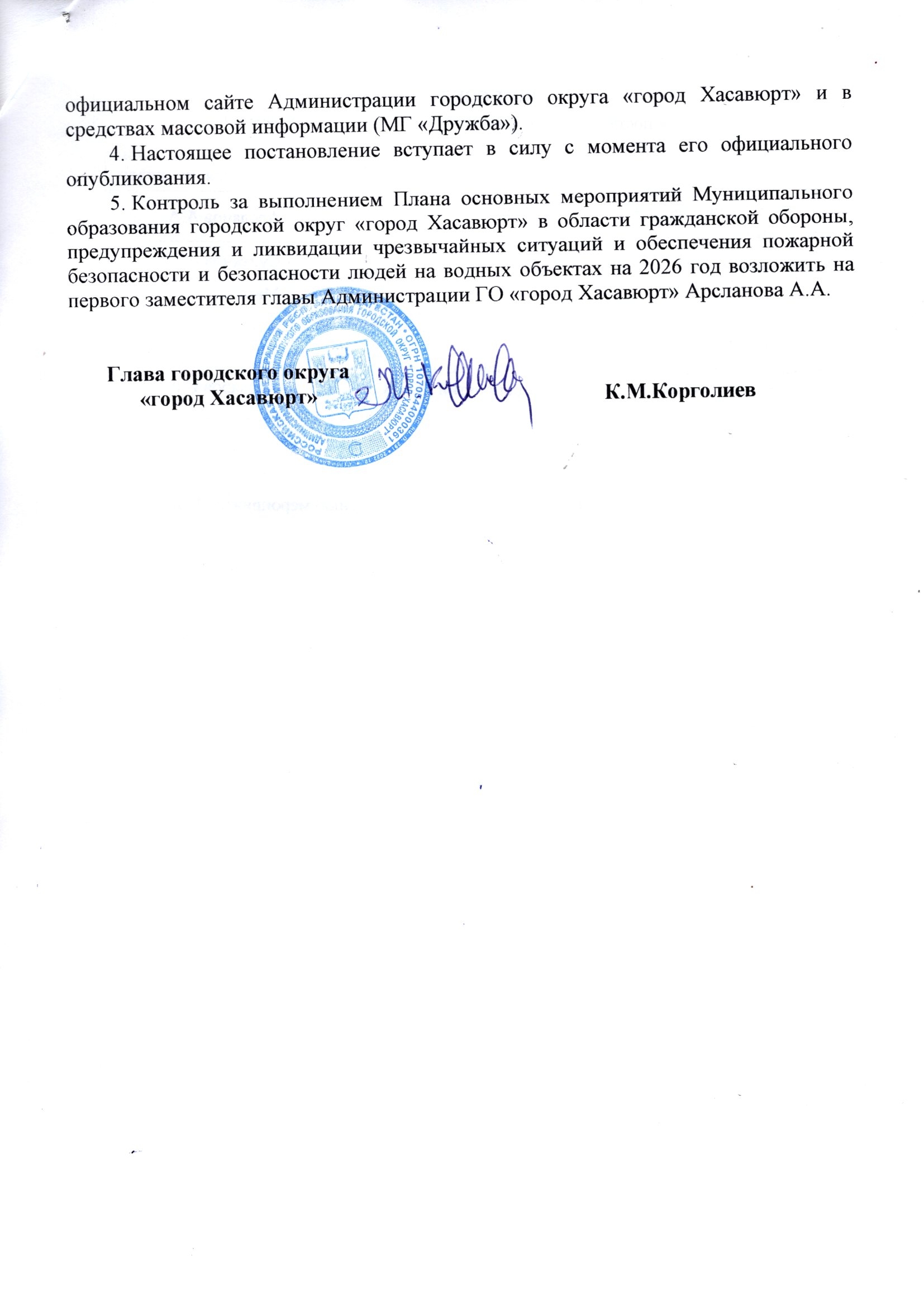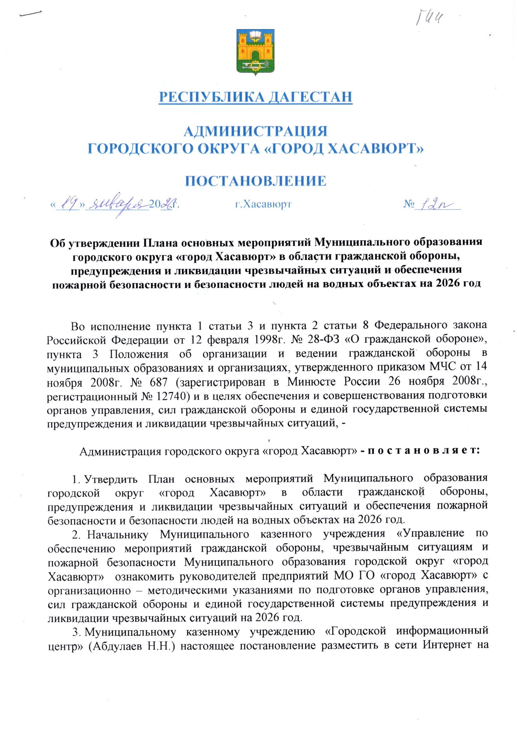 Постановление от 19 января 2026 г. № 12п Об утверждении Плана основных мероприятий Муниципального образования городского округа «город Хасавюрт» в области гражданской обороны, предупреждения и ликвидации чрезвычайных ситуаций и обеспечения пожарной безопасности и безопасности людей на водных объектах на 2026 год