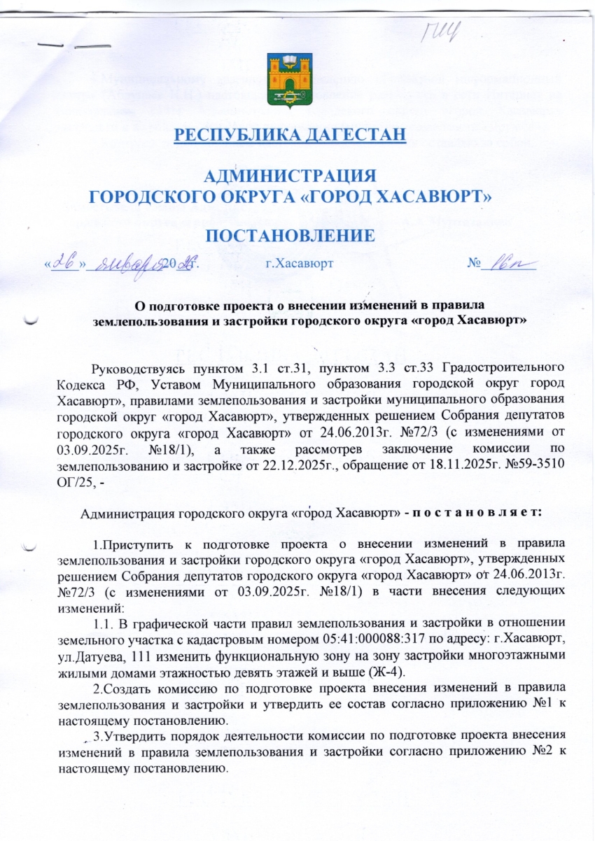 Постановление от 26 января 2026 г. № 16 п О подготовке проекта о внесении изменений в правила землепользования и застройки городского округа «город Хасавюрт»