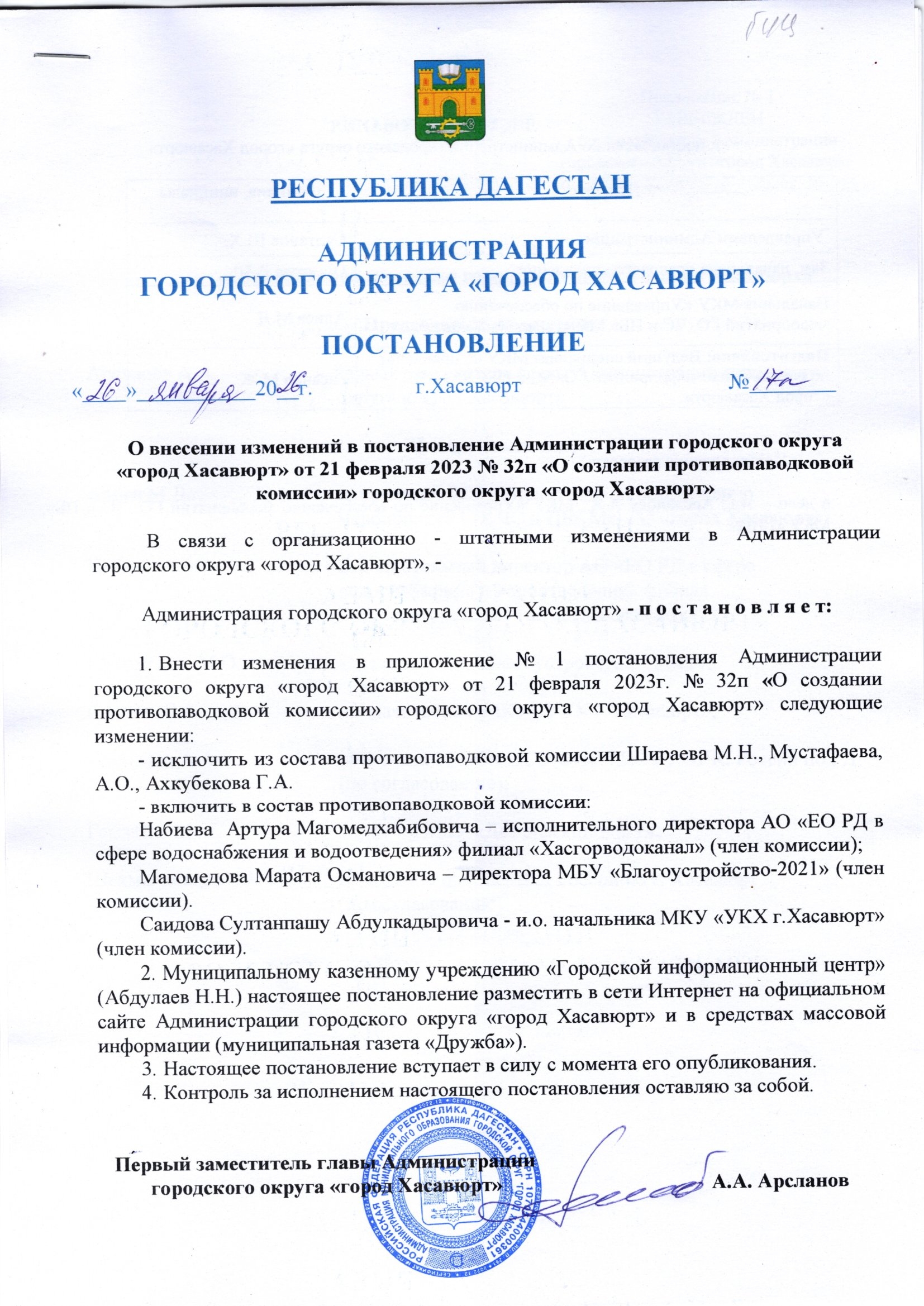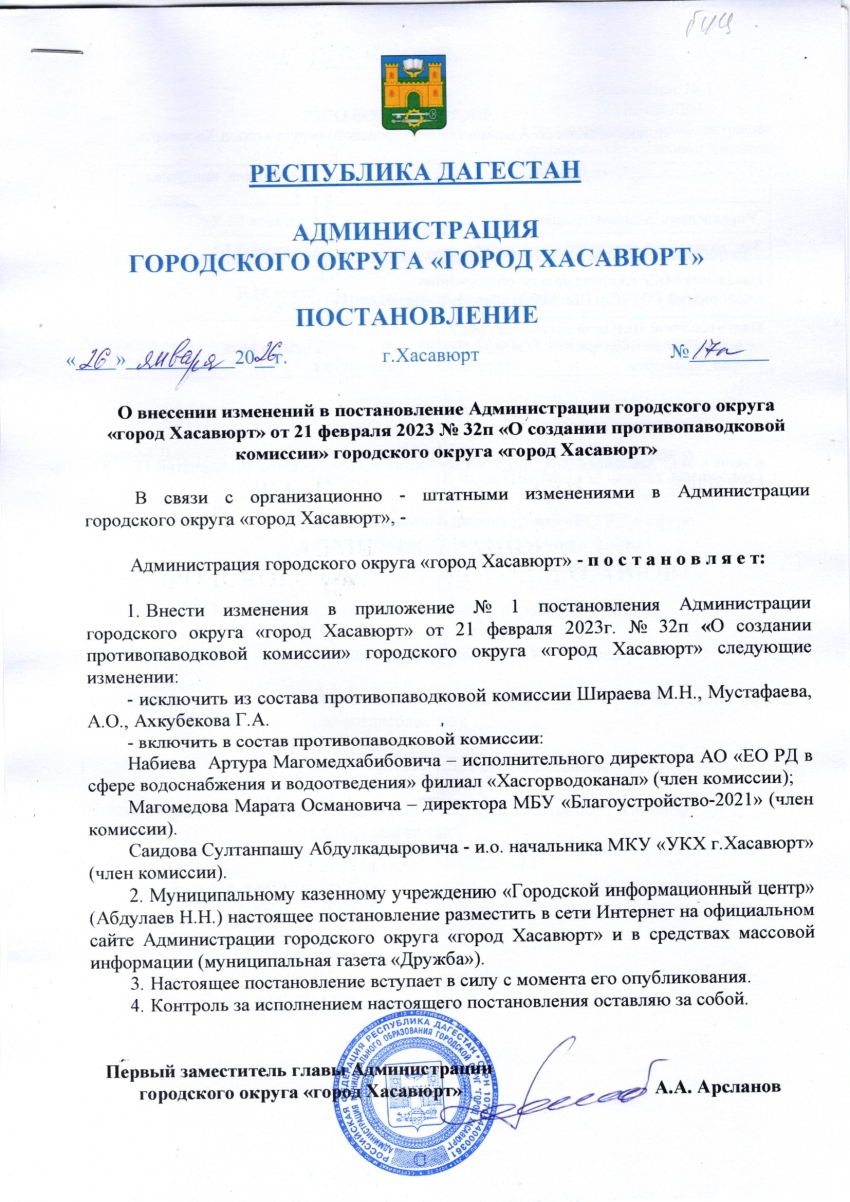 Постановление от 26 января 2026 г. № 17 п О внесении изменений в постановление Администрации городского округа «город Хасавюрт» от 21 февраля 2023 № 32п «О создании противопаводковой комиссии» городского округа «город Хасавюрт»