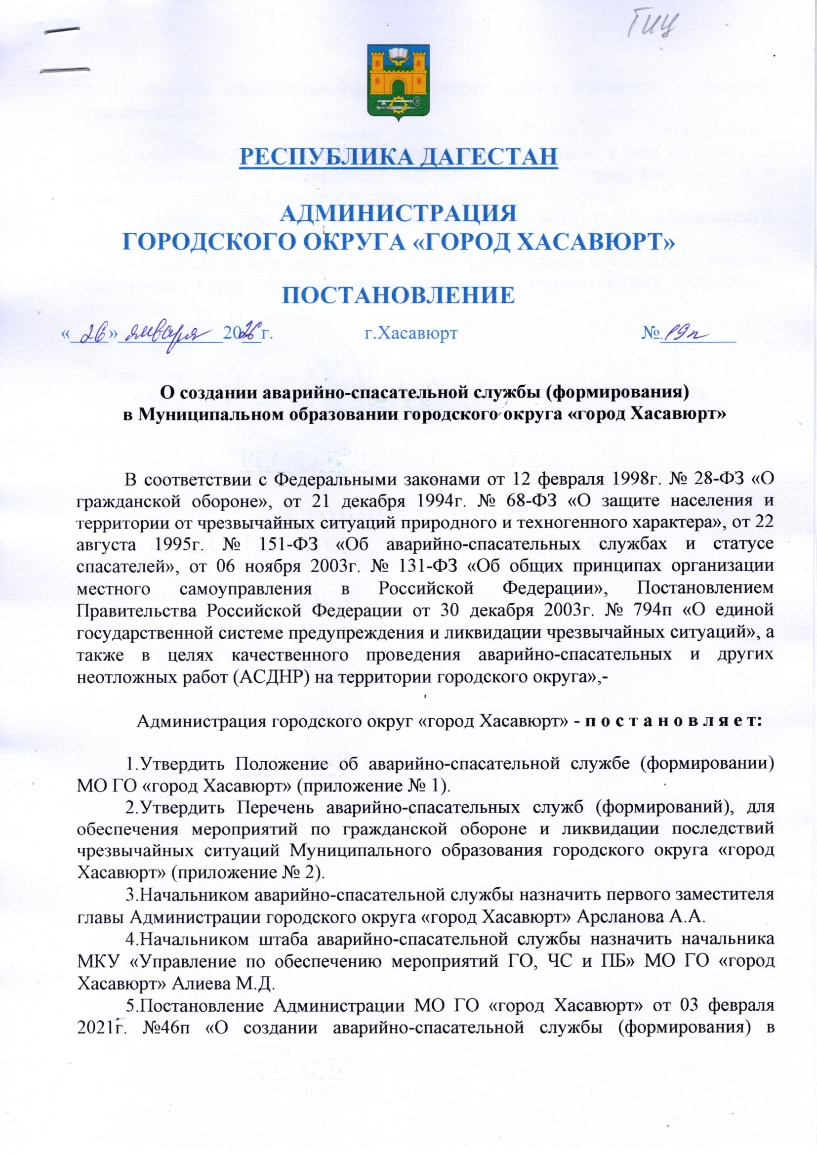 Постановление от 26 января 2026 г. № 19 п О создании аварийно-спасательной службы (формирования) в Муниципальном образовании городского округа «город Хасавюрт»