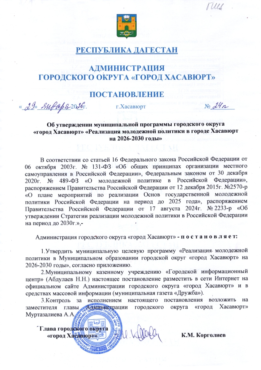 Постановление от 29 января 2026 г. № 24 п Об утверждении муниципальной программы городского округа "город Хасавюрт" "Реализация молодежной политики в городе Хасавюрт на 2026-2030 годы"