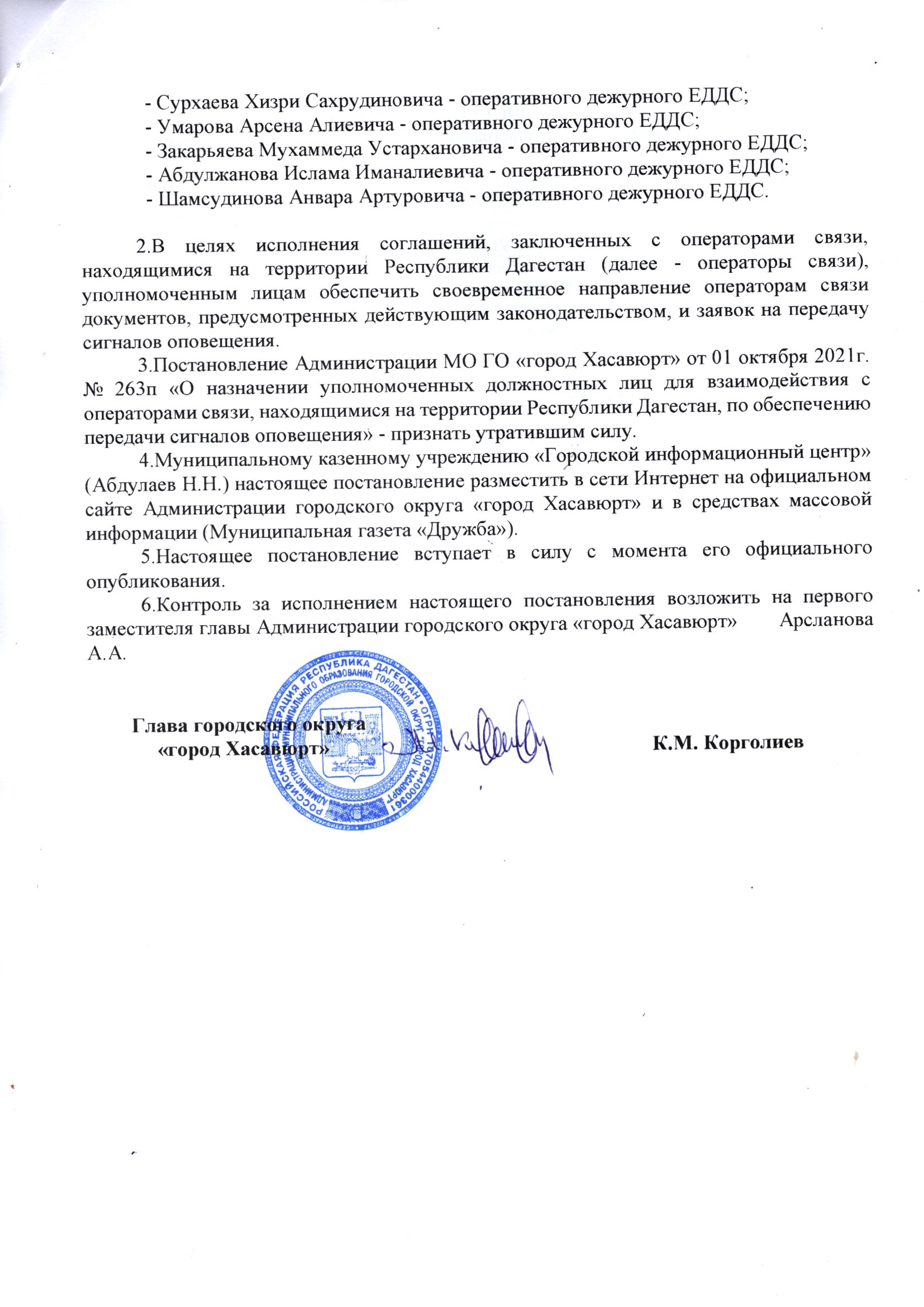 Постановление №263п от 1 октября 2021г о назначении уполномоченных должностных лиц для взаимодействия с операторами связи, находящимися на территории Республики Дагестан, по обеспечению передачи сигналов оповещения