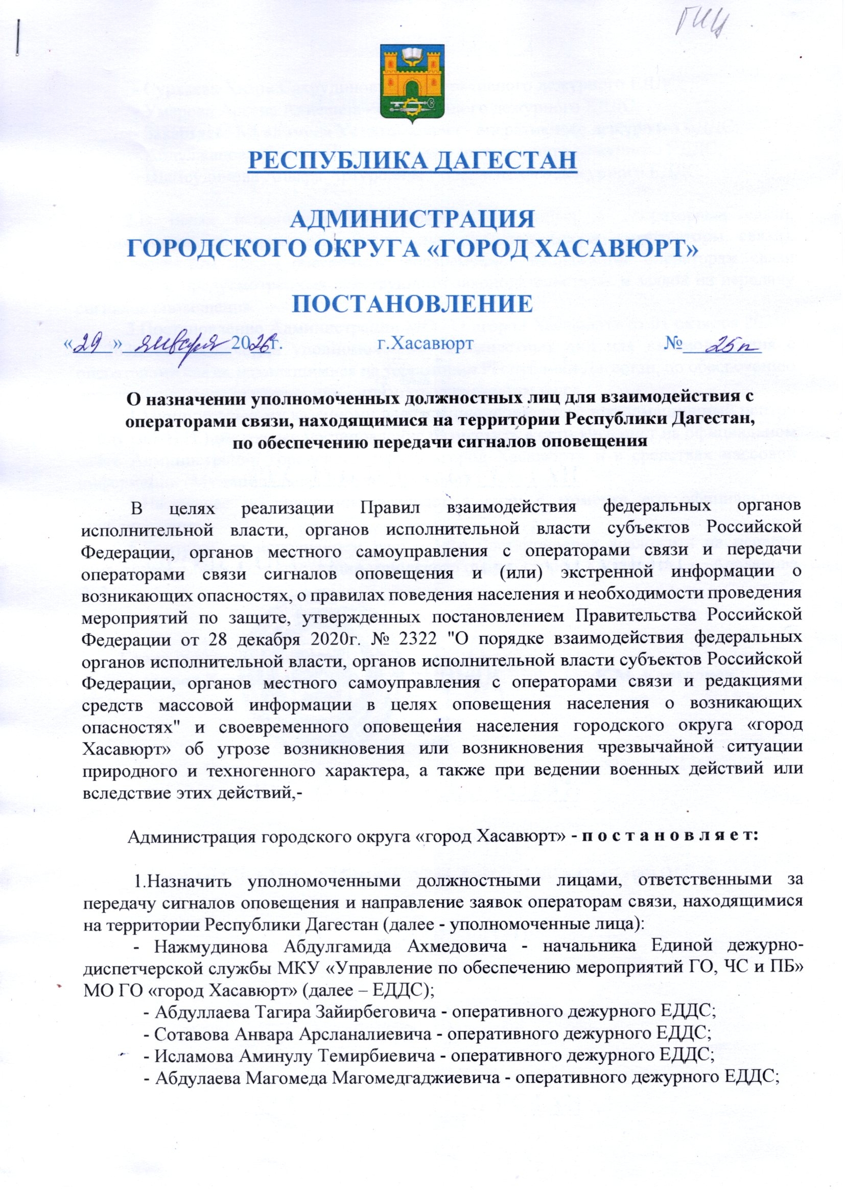 Постановление от 29 января 2026 г. № 25 п О назначении уполномоченных должностных лиц для взаимодействия с операторами связи, находящимися на территории Республики Дагестан, по обеспечению пересдачи сигналов оповещения