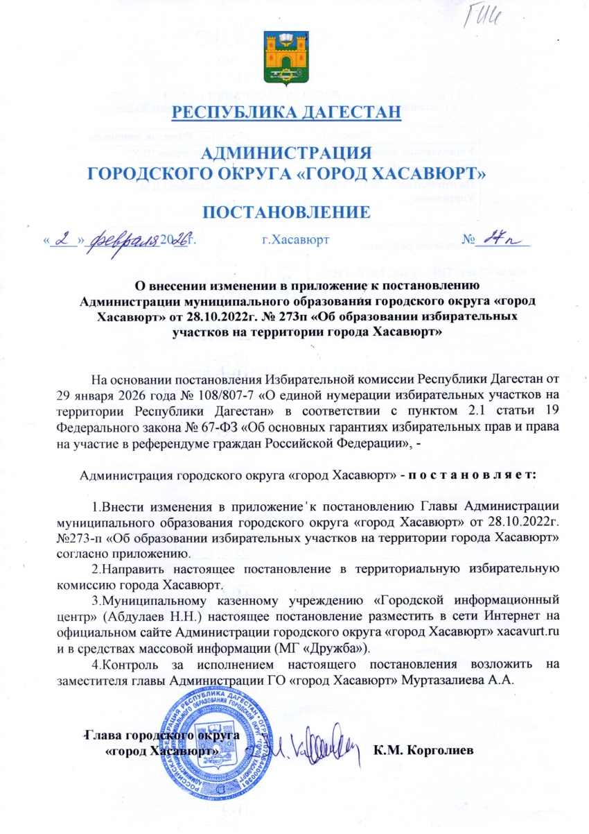 Постановление от 2 февраля 2026 г. № 27 п О внесении изменении в приложение к постановлению Администрации муниципального образования городского округа «город Хасавюрт» от 28.10.2022г. № 273п «Об образовании избирательных участков на территории города Хасавюрт»