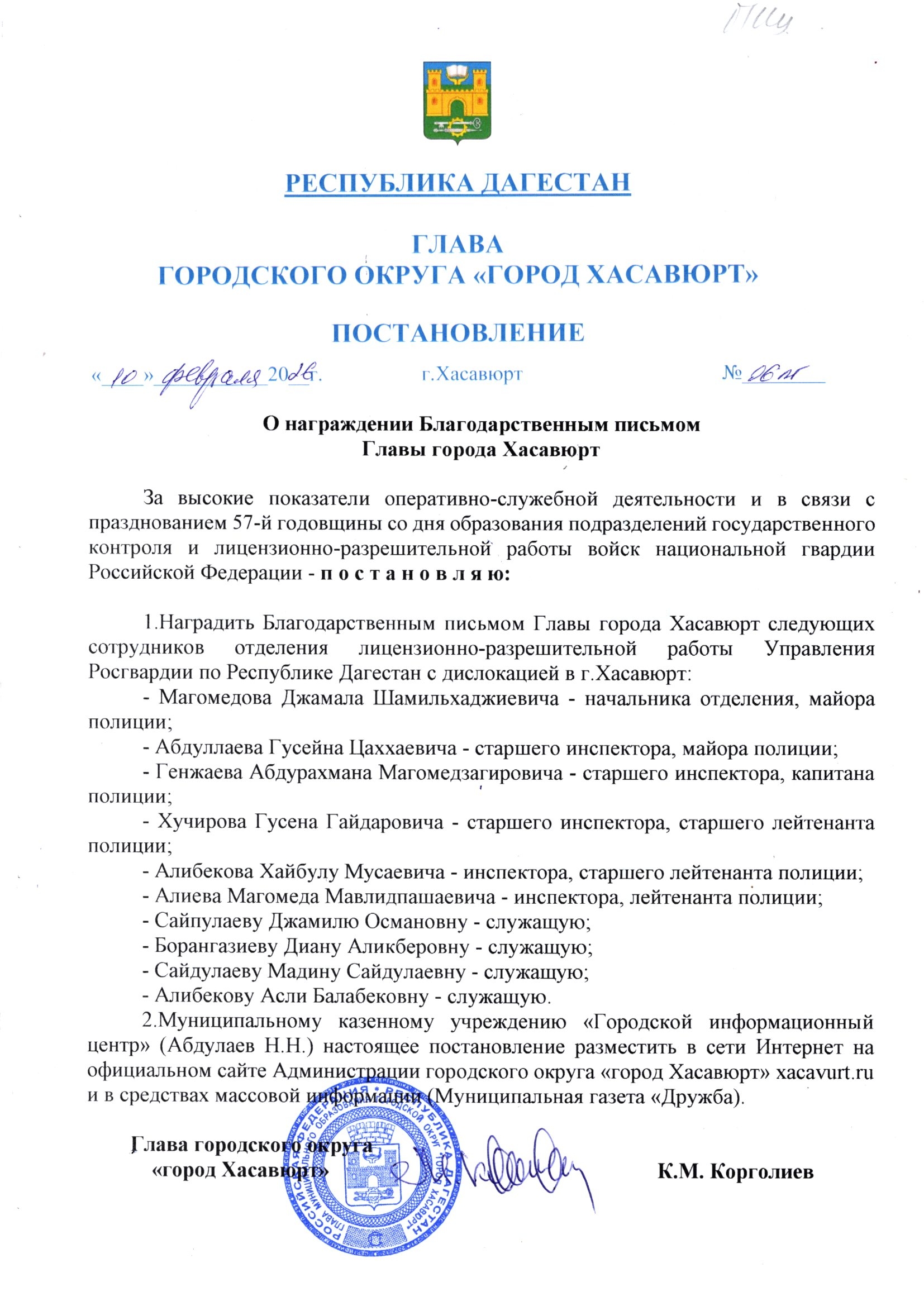 Постановление от 4 февраля 2025 г. № 06 пг О награждении Благодарственным письмом Главы города Хасавюрт