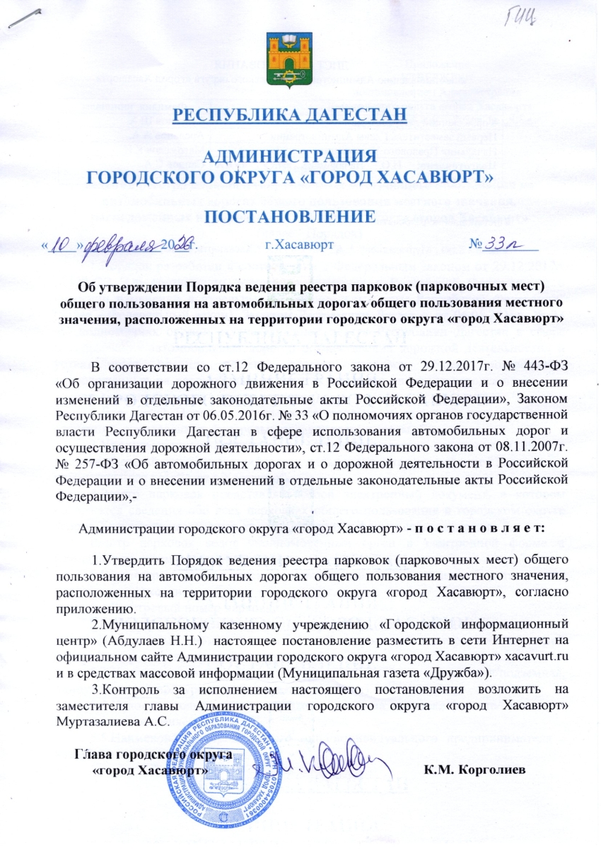 Постановление от 10 февраля 2026г. № 33 п Об утверждении Порядка реестра парковок (парковочных мест) общего пользования на автомобильных дорогах общего пользования местного значения, расположенных на территории городского округа "город Хасавюрт"