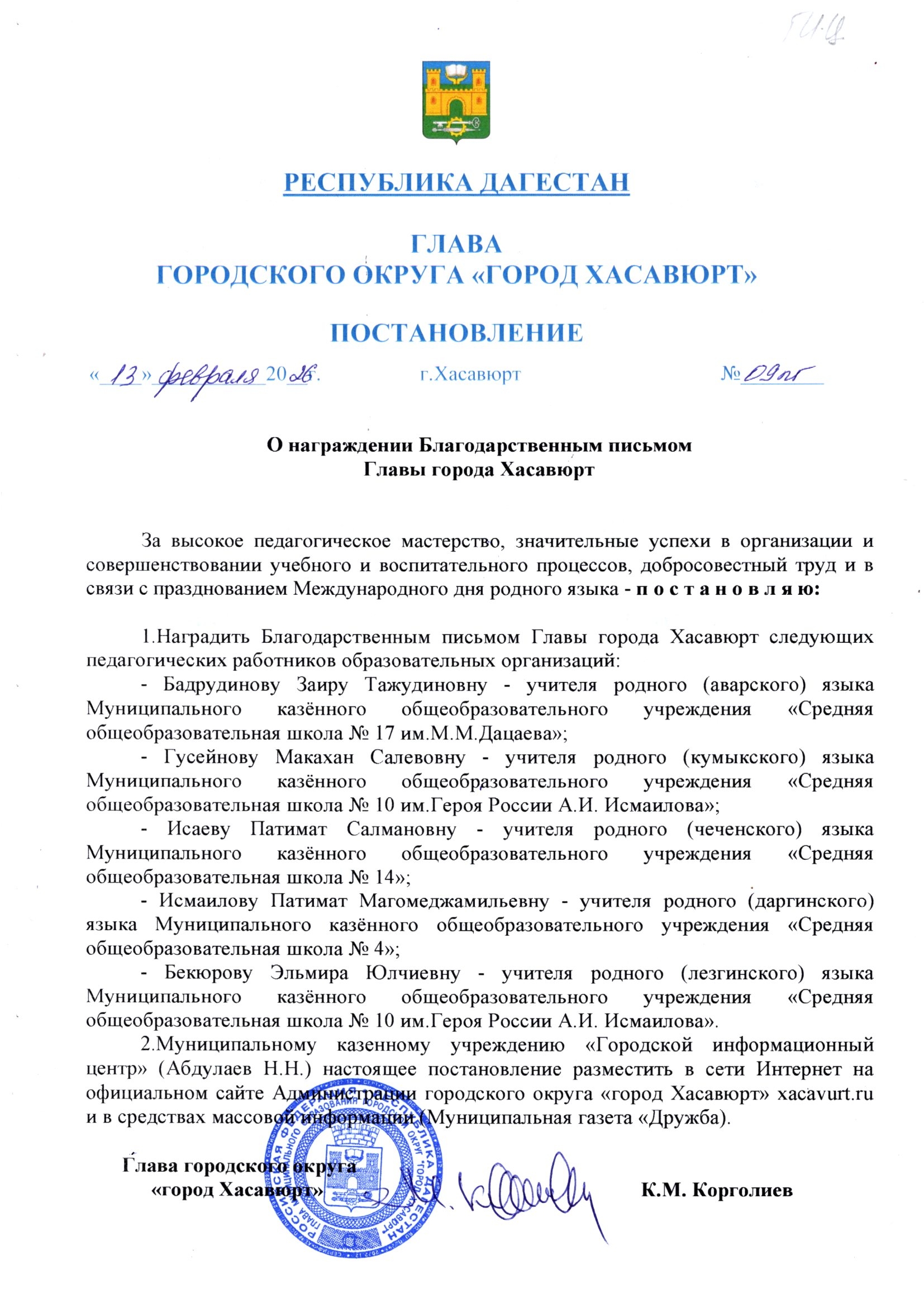 Постановление от 13 февраля 2026 г. № 09пг О награждении Благодарственным письмом Главы города Хасавюрт