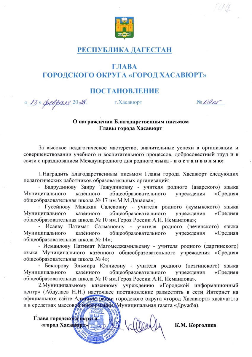 Постановление от 14 февраля 2025 г. № 08 пг О награждении Благодарственным письмом Главы города Хасавюрт