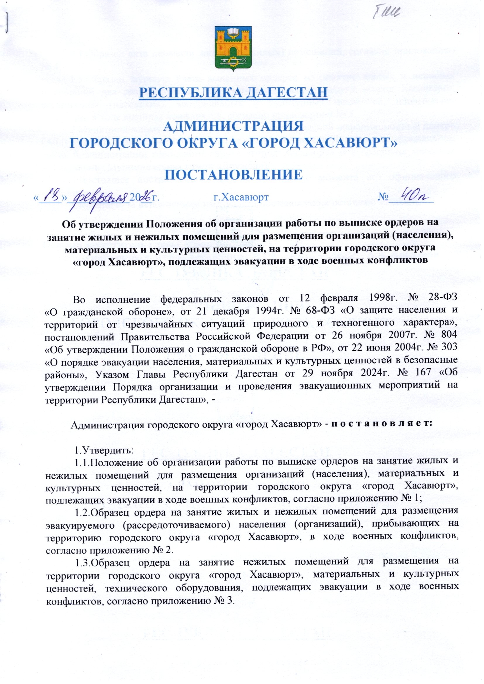 Постановление от 18 февраля 2026 г. № 40 п Об утверждении Положения об организации работы по выписке ордеров на занятие жилых и нежилых помещений для размещения организаций (населения), материальных и культурных ценностей, на территории городского округа «город Хасавюрт», подлежащих эвакуации в ходе военных конфликтов