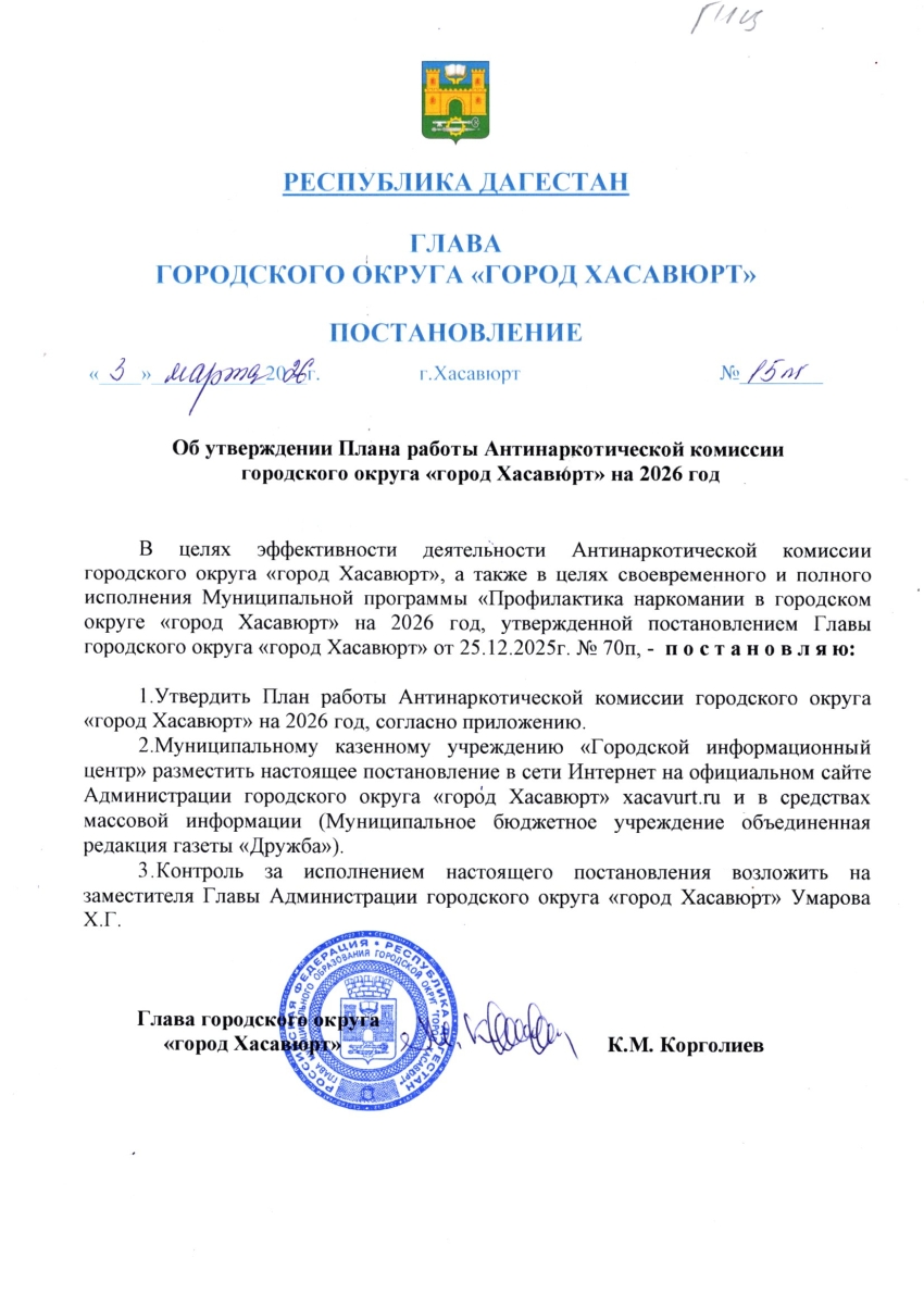 Постановление от 3 марта 2026 г. № 15 пг Об утверждении Плана работы Антинаркотической комиссии городского округа "город Хасавюрт" на 2026 год