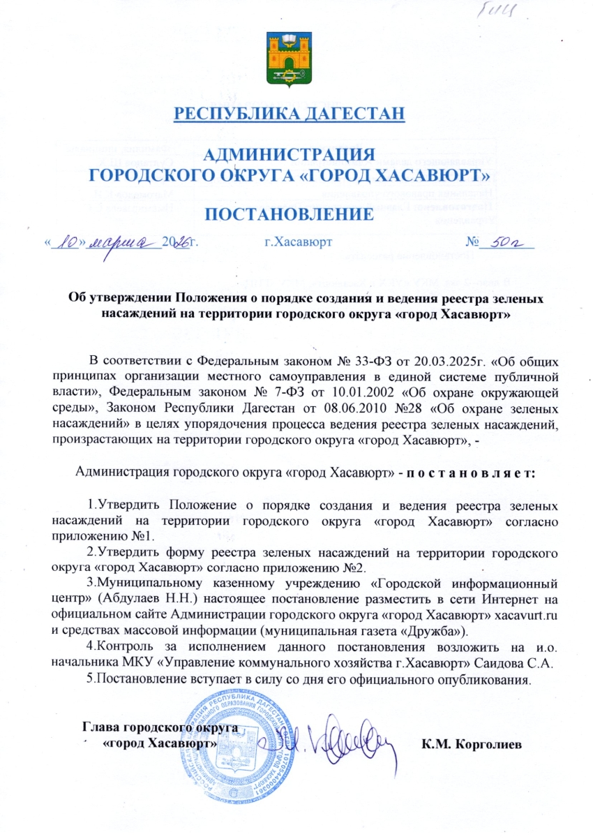 Постановление от 10 марта 2026 г. № 50 п Об утверждении Положения о порядке создания и ведения реестра зеленых насаждений на территории городского округа "город Хасавюрт"