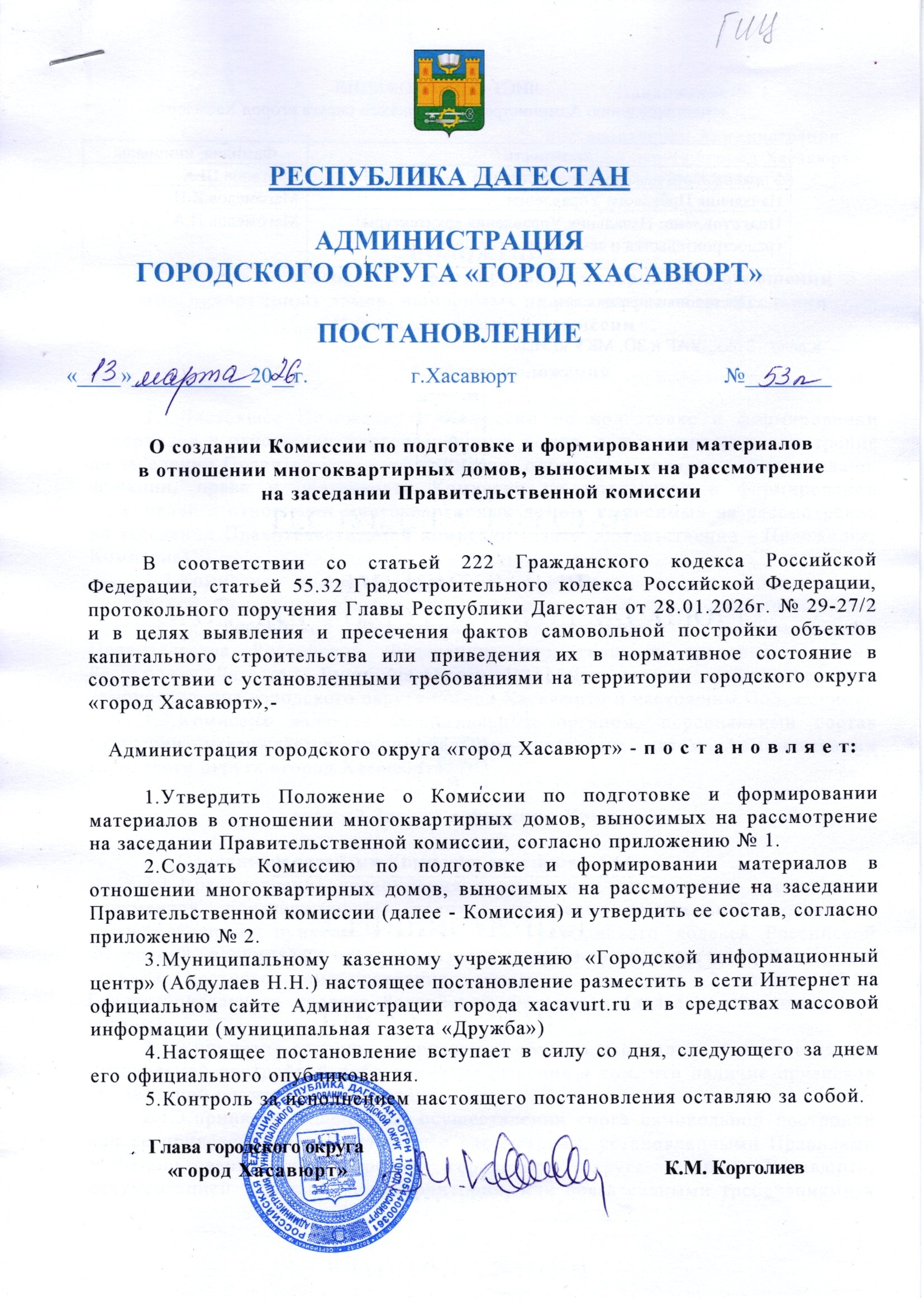 Постановление от 13 марта 2026 г. № 53 п О создании Комиссии по подготовке и формировании материалов в отношении многоквартирных домов, выносимых на рассмотрение на заседании Правительственной комиссии