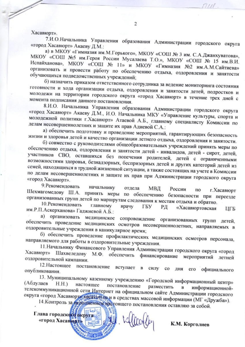 Постановление №157п от 26 апреля 2022г о мерах по организации отдыха, оздоровления и занятости детей, подростков и молодежи на территории Муниципального образования городской округ "город Хасавюрт"