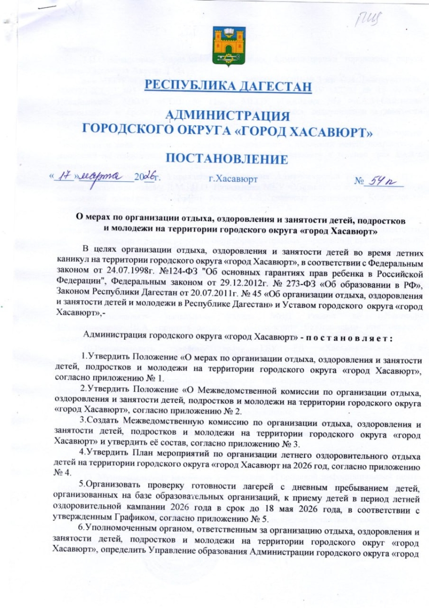 Постановление от 17 марта 2026 г. № 54 п О мерах по организации отдыха, оздоровления и занятости детей, подростков и молодежи на территории городского округа "город Хасавюрт"