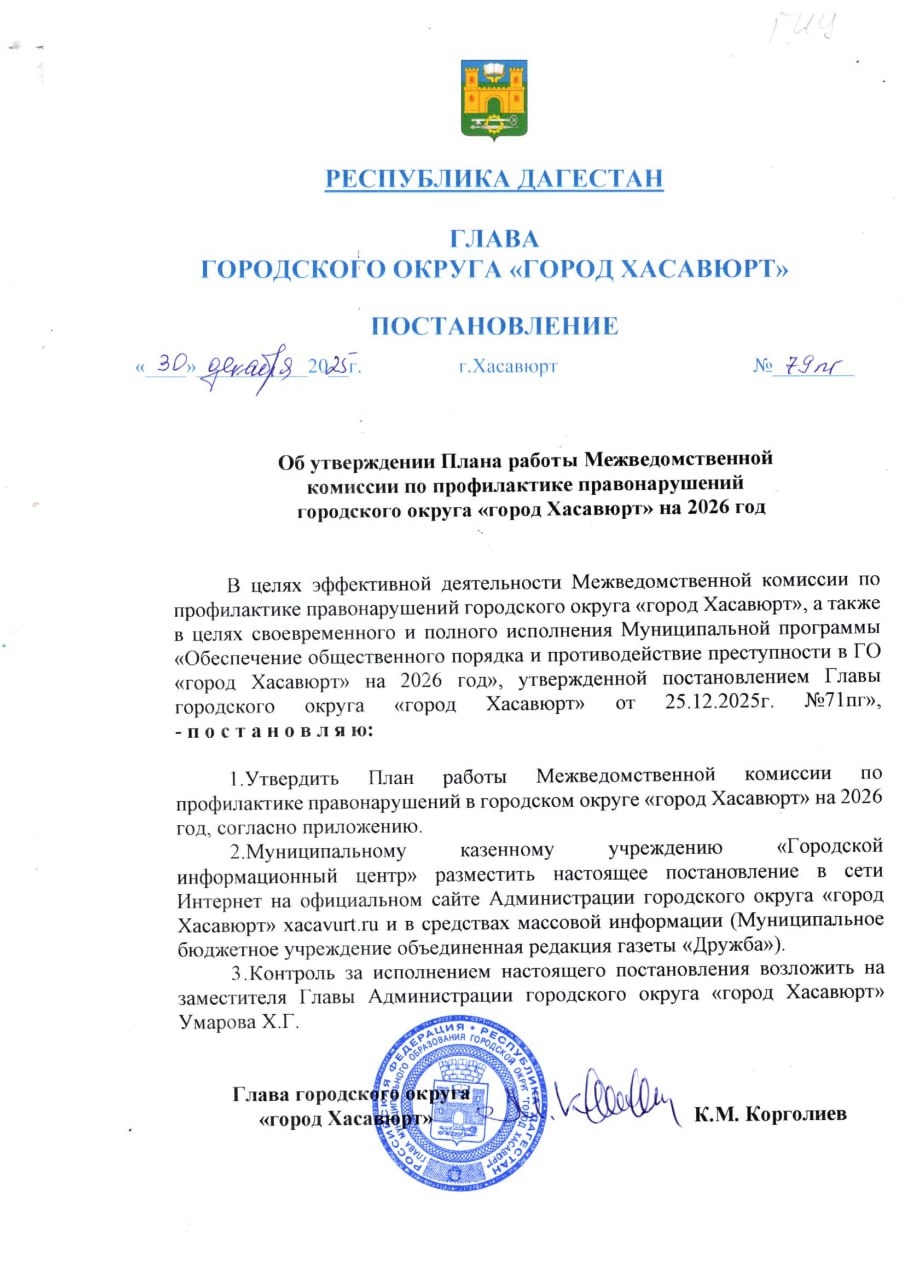 Постановление от 30 декабря 2025 г. № 79 пг Об утверждении Плана работы Межведомственной комиссии по профилактике правонарушений городского округа "город Хасавюрт" на 2026 год