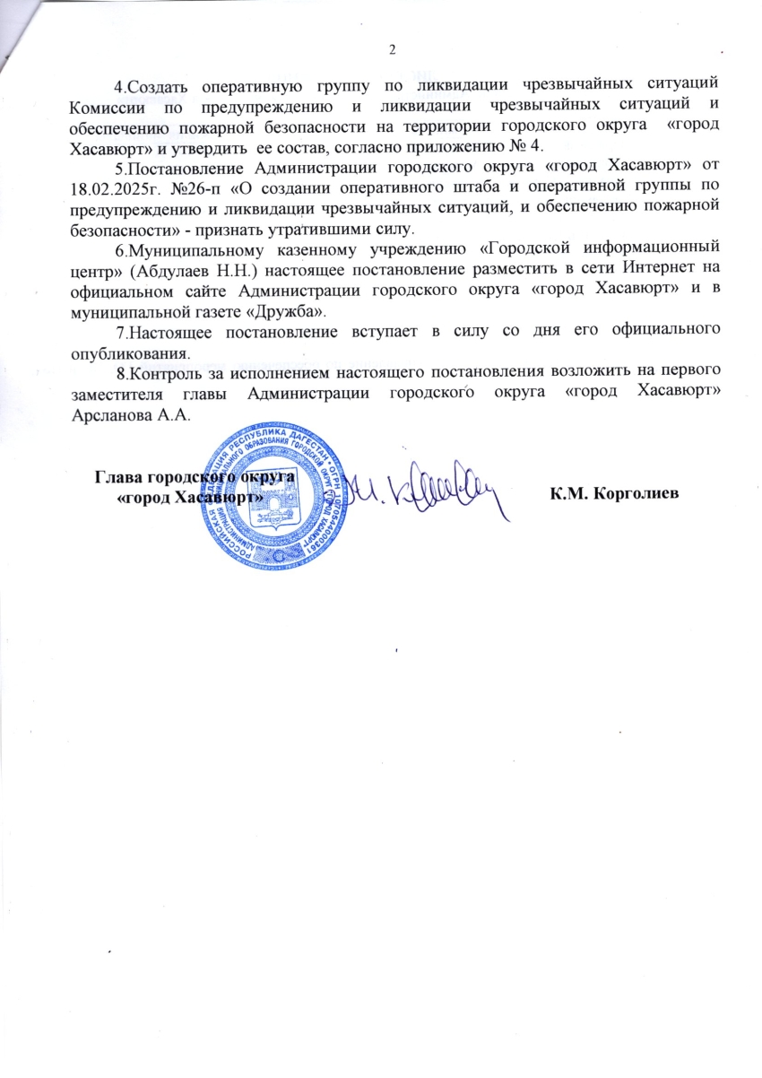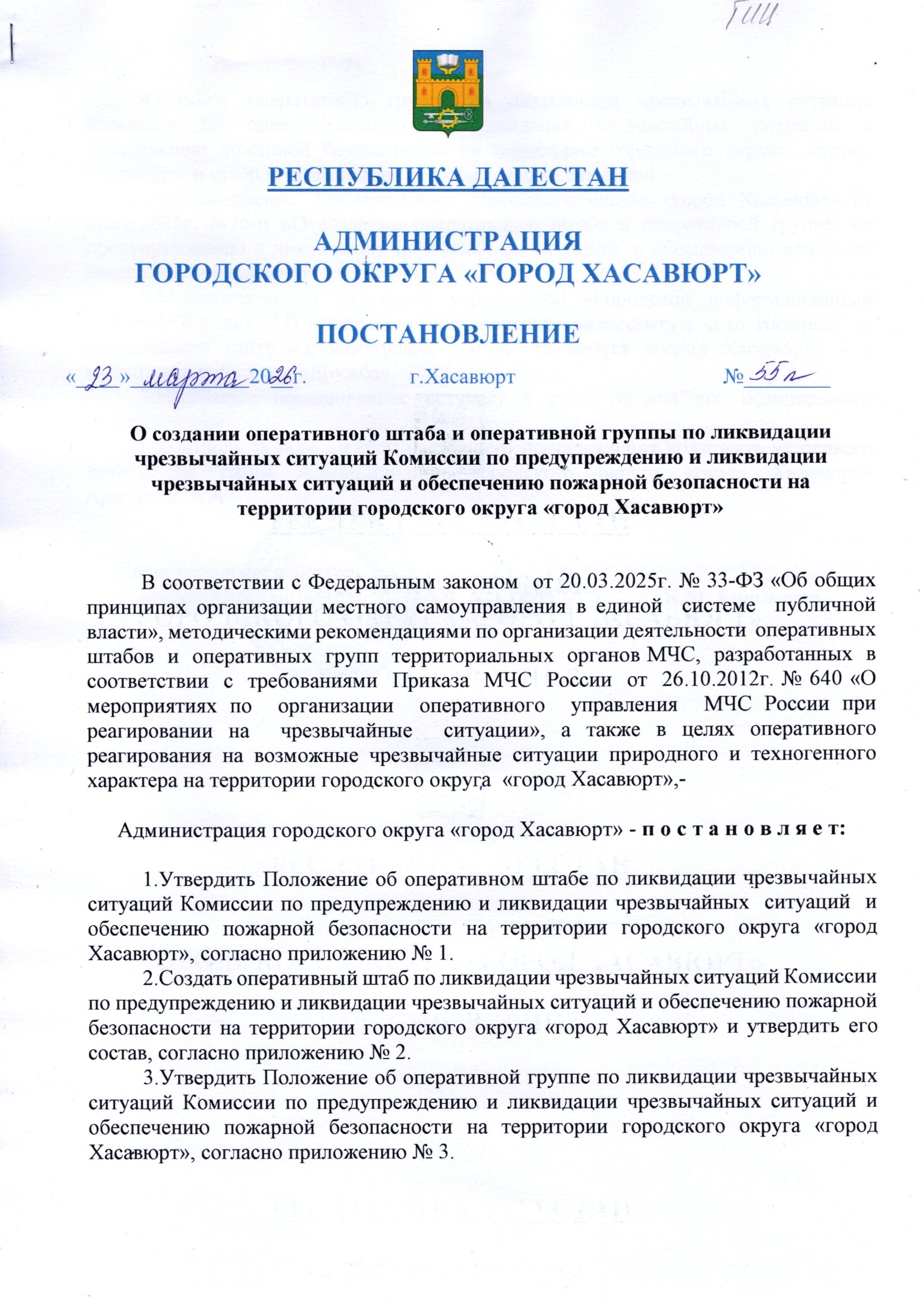 Постановление от 23 марта 2026 г. № 55 п О создании оперативного штаба и оперативной группы по ликвидации чрезвычайных ситуаций Комиссии по предупреждению и ликвидации чрезвычайных ситуаций и обеспечению пожарной безопасности на территории городского округа "город Хасавюрт"