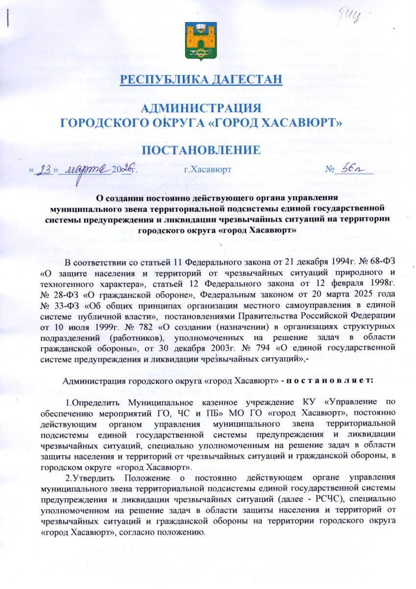 Постановление от 23 марта 2026 г. № 56 п О создании постоянно действующего органа управления муниципального звена территориальной подсистемы единой государственной системы предупреждения и ликвидации чрезвычайных ситуаций на территории городского округа "город Хасавюрт"
