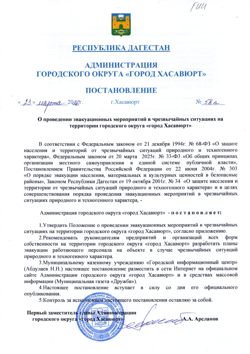 Постановление от 23 марта 2026 г. № 58 п О проведении эвакуационных мероприятий в чрезвычайных ситуациях на территории городского округа "город Хасавюрт"