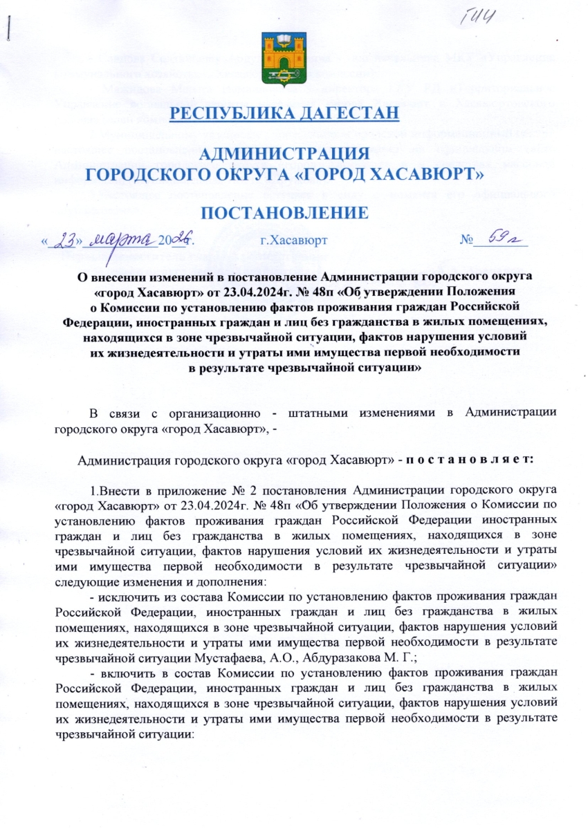 Постановление от 23 марта 2026 г. № 59 п О внесении изменений в постановление Администрации городского округа «город Хасавюрт» от 23.04.2024г. № 48п «Об утверждении Положения о Комиссии по установлению фактов проживания граждан Российской Федерации, иностранных граждан и лиц без гражданства в жилых помещениях, находящихся в зоне чрезвычайной ситуации, фактов нарушения условий их жизнедеятельности и утраты ими имущества первой необходимости в результате чрезвычайной ситуации»
