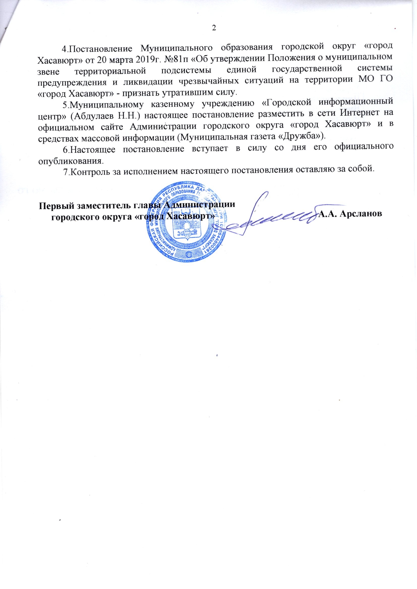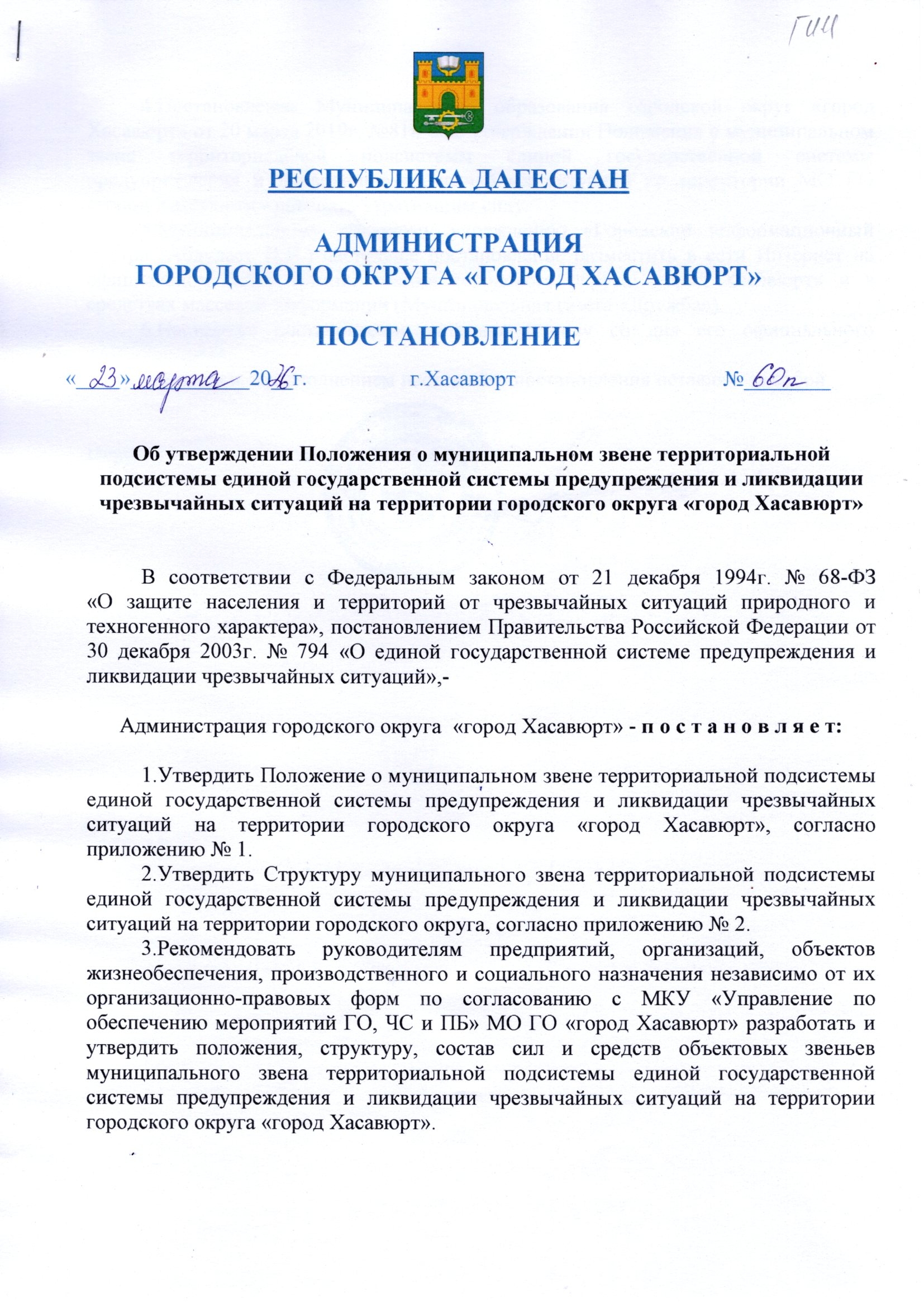 Постановление от 23 марта 2026 г. № 60 п Об утверждении Положения о муниципальном звене территориальной подсистемы единой государственной системы предупреждения и ликвидации чрезвычайных ситуаций на территории городского округа "город Хасавюрт"