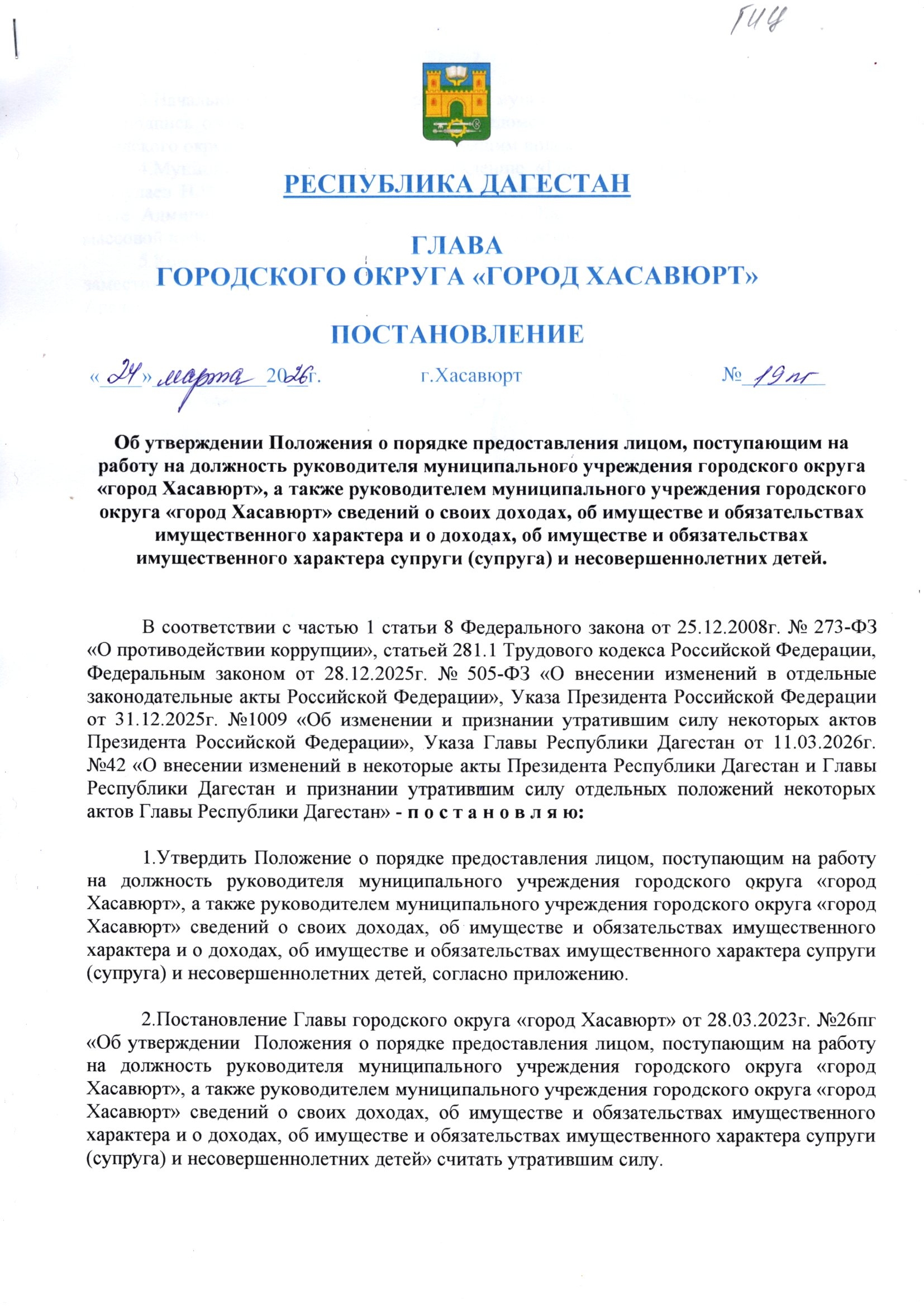 Постановление от 24 марта 2026г. № 19 пг Об утверждении Положения о порядке предоставления лицом, поступающим на работу на должность руководителя муниципального учреждения городского округа «город Хасавюрт» сведений о своих доходах, об имуществе