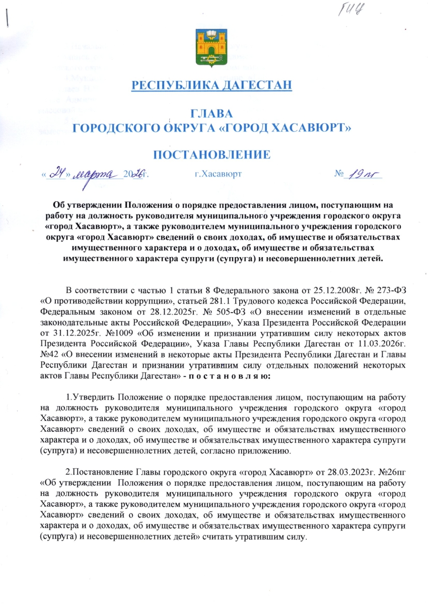 Постановление от 24 марта 2026г. № 19 пг Об утверждении Положения о порядке предоставления лицом, поступающим на работу на должность руководителя муниципального учреждения городского округа «город Хасавюрт», а также руководителем муниципального учреждения городского округа «город Хасавюрт» сведений о своих доходах, об имуществе и обязательствах имущественного характера и о доходах, об имуществе и обязательствах имущественного характера супруги (супруга) и несовершеннолетних детей