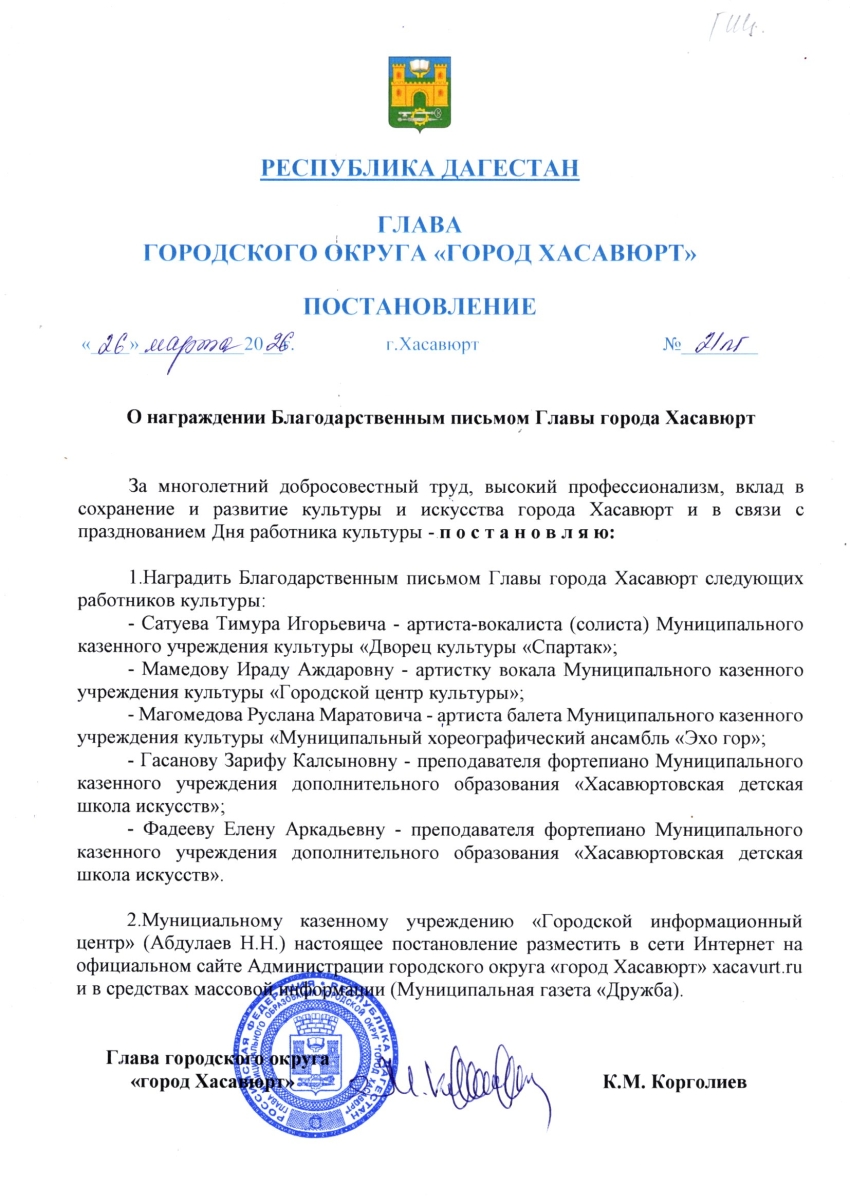 Постановление от 26 марта 2026г. № 21 пг О награждении Благодарственным письмом Главы города Хасавюрт