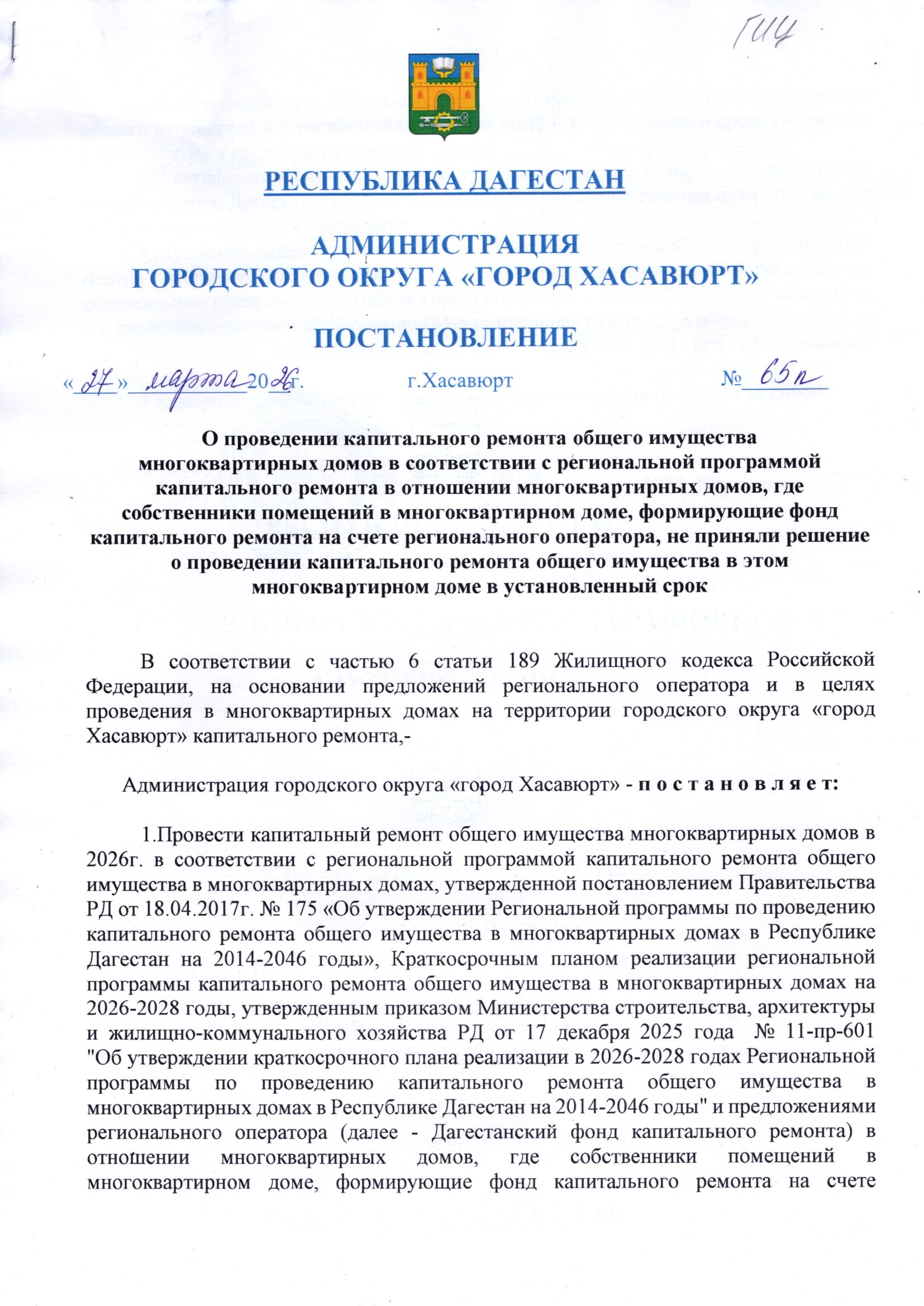Постановление от 27 марта 2026г. № 65 п О проведении капитального ремонта общего имущества многоквартирных домов в соответствии с региональной программой капитального ремонта в отношении многоквартирных домов, где собственники помещений в многоквартирном доме, формирующие фонд капитального ремонта на счете регионального оператора, не приняли решение о проведении капитального ремонта общего имущества в этом многоквартирном доме в установленный срок