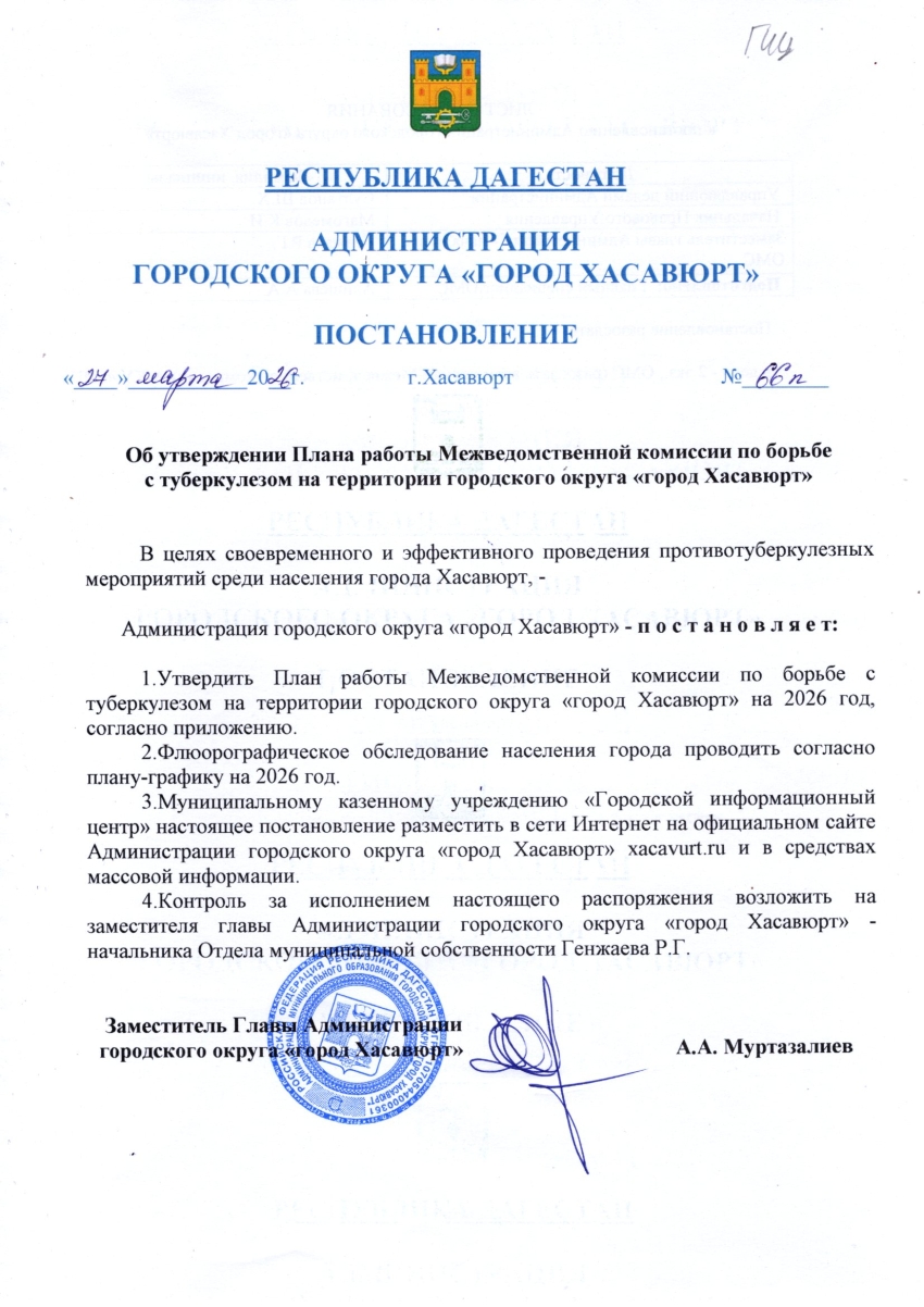 Постановление от 27 марта 2026г. № 66 п Об утверждении Плана работы Межведомственной комиссии по борьбе с туберкулезом на территории городского округа "город Хасавюрт"