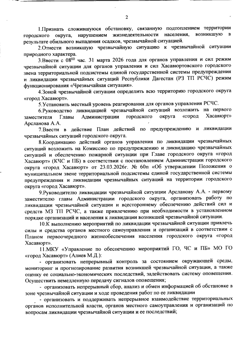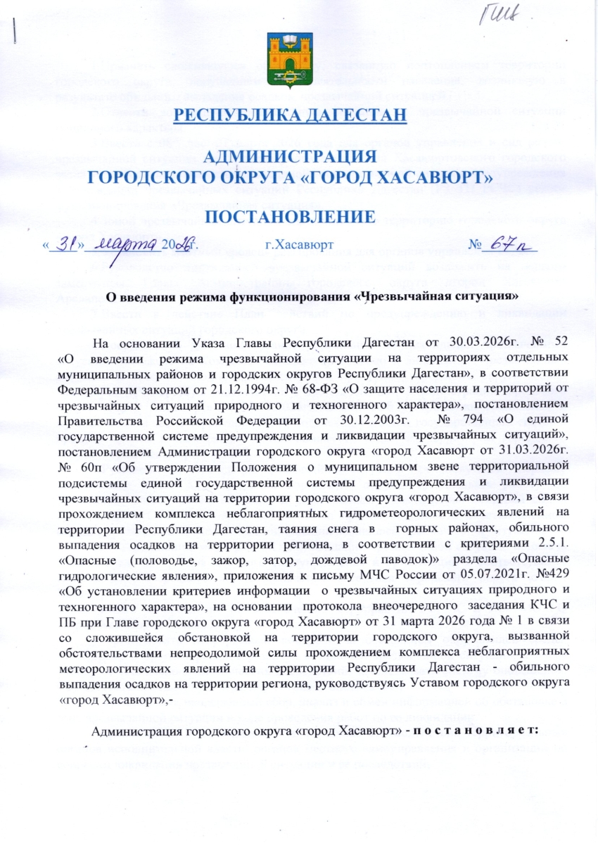 Постановление от 31 марта 2026г. № 67 п О введении режима функционирования "Чрезвычайная ситуация"