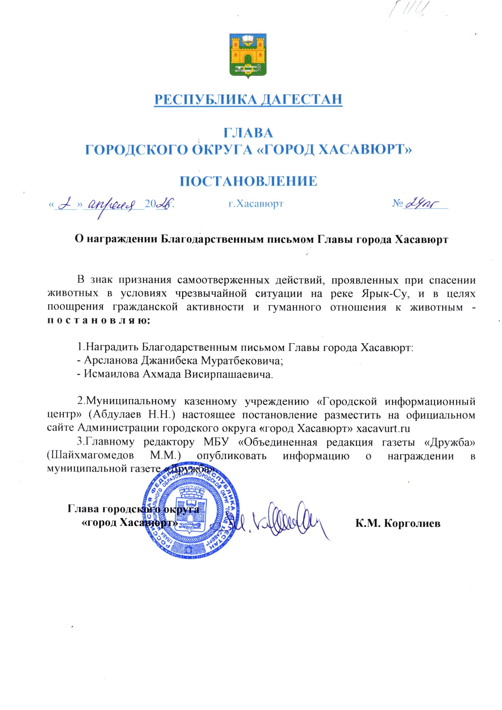 Постановление от 2 апреля 2026 г. № 24 пг О награждении Благодарственным письмом Главы города Хасавюрт