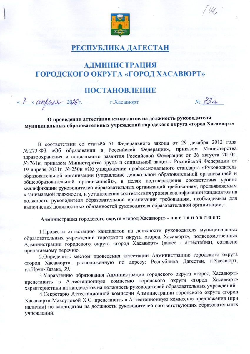 Постановление от 7 апреля 2026 г. № 73 п О проведении аттестации кандидатов на должность руководителя муниципальных образовательных учреждений городского округа "город Хасавюрт"
