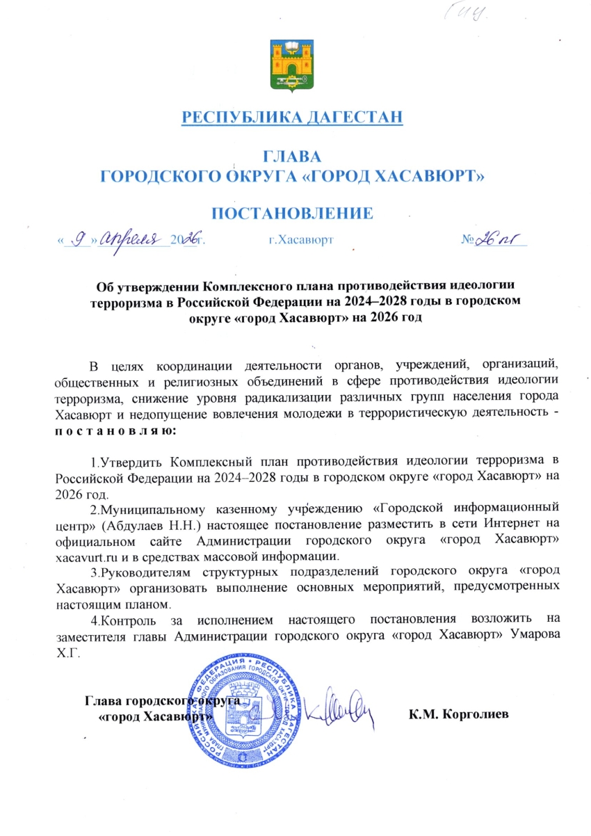 Постановление от 9 апреля 2026 г. № 26 пг Об утверждении Комплексного плана противодействия идеологии терроризма в Российский Федерации на 2024-2028 годы в городском округе "город Хасавюрт" на 2026 год