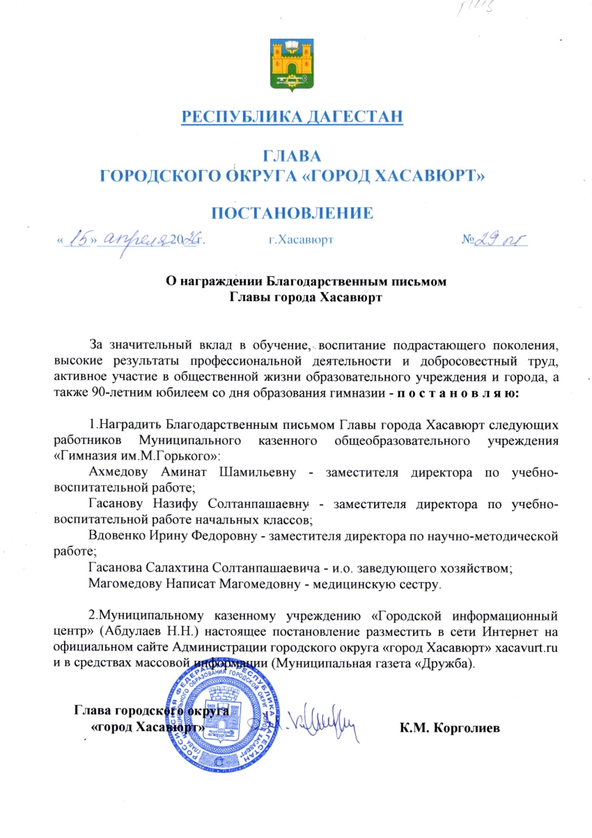 Постановление от 15 апреля 2026 г. № 29 пг О награждении Благодарственным письмом Главы города Хасавюрт