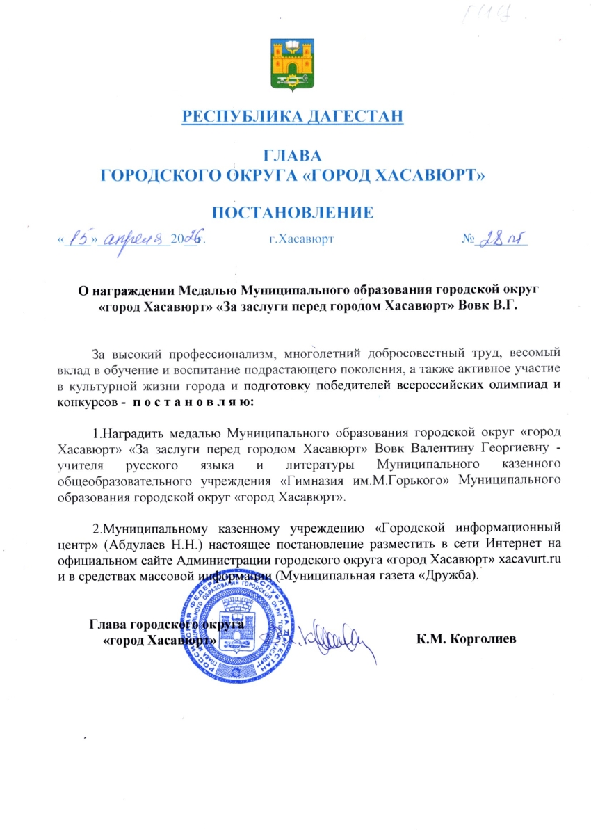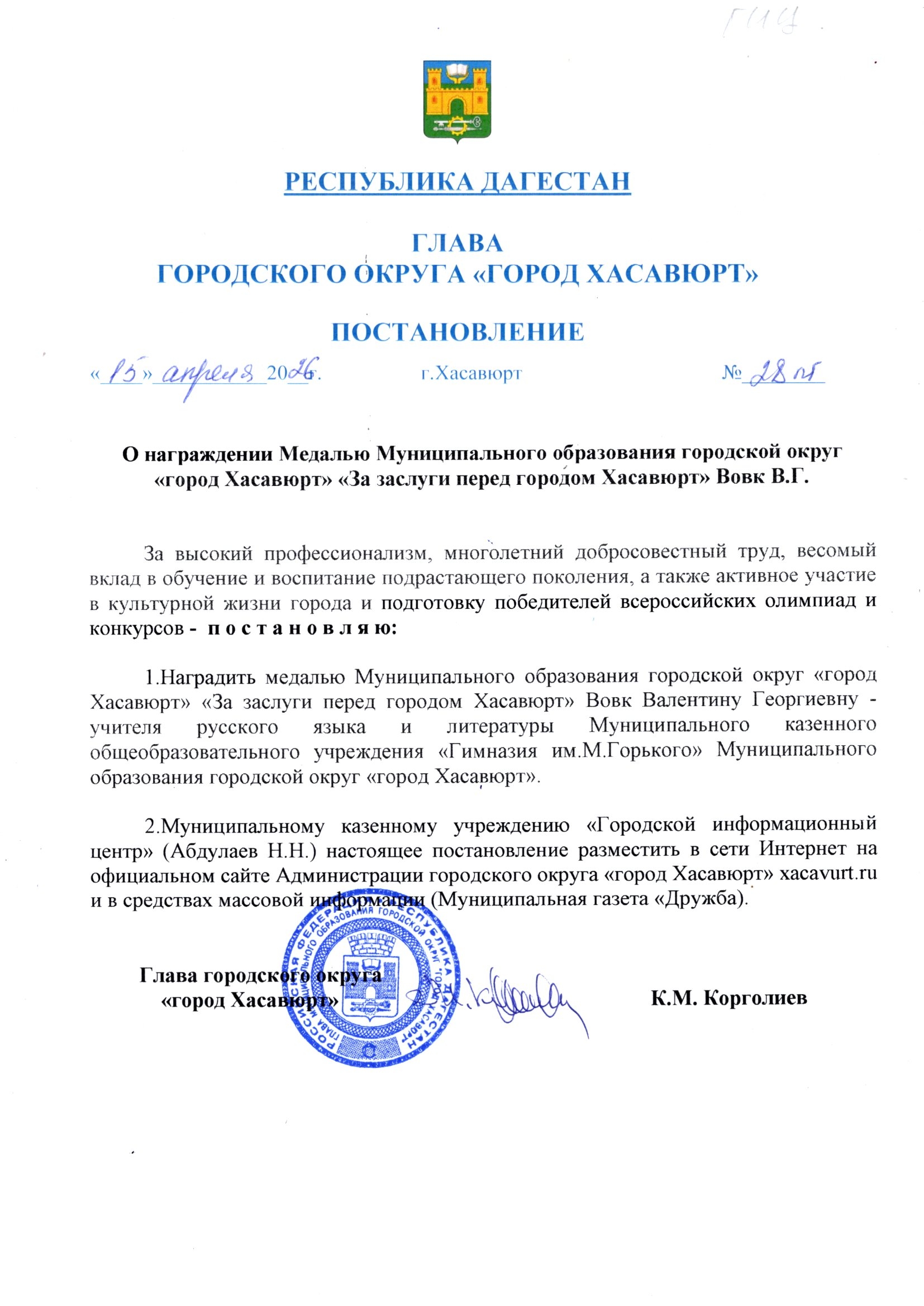 Постановление от 15 апреля 2026 г. № 28 пг О награждении Медалью Муниципального образования городской округ "город Хасавюрт" "За заслуги перед городом Хасавюрт" Вовк В.Г.