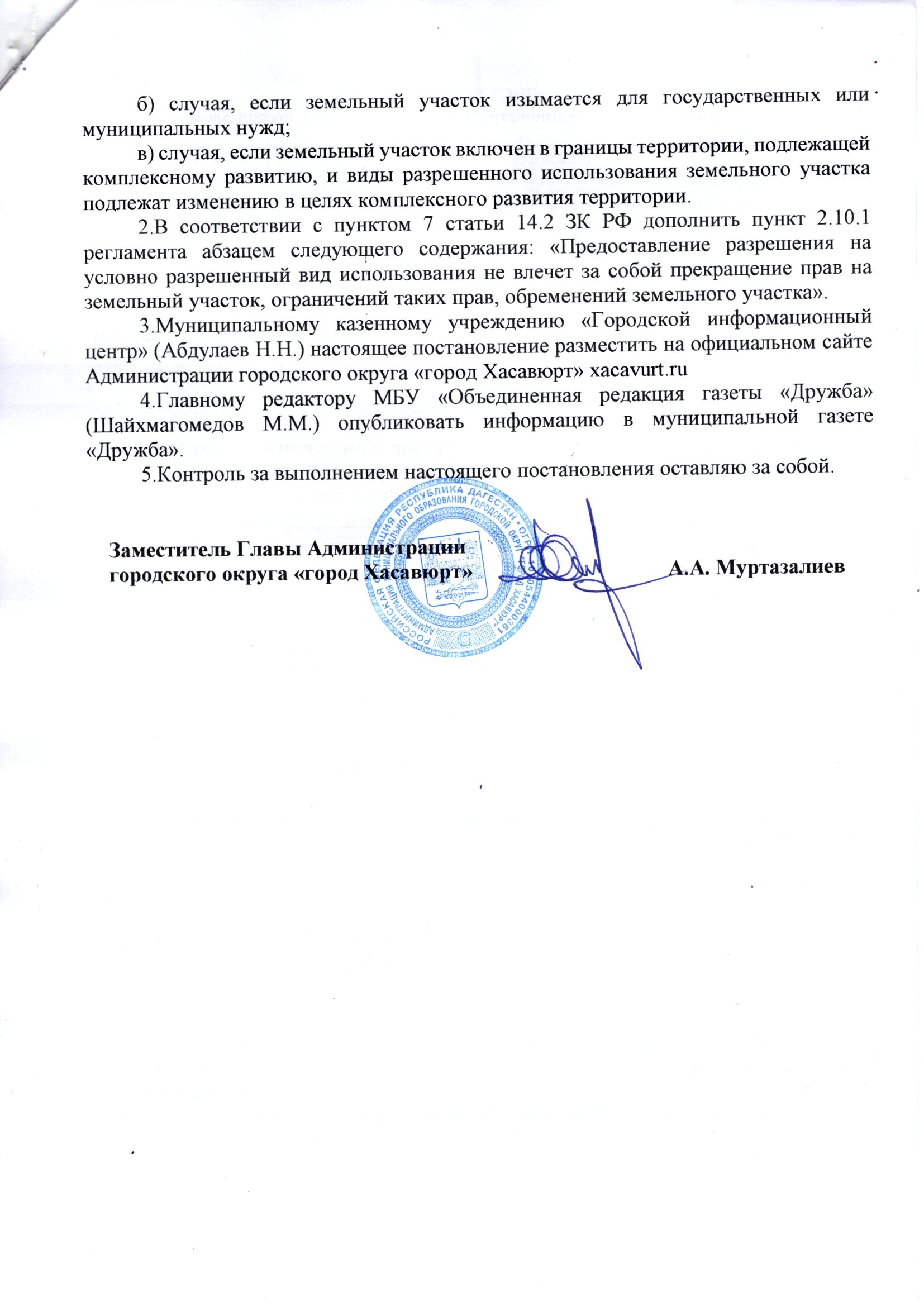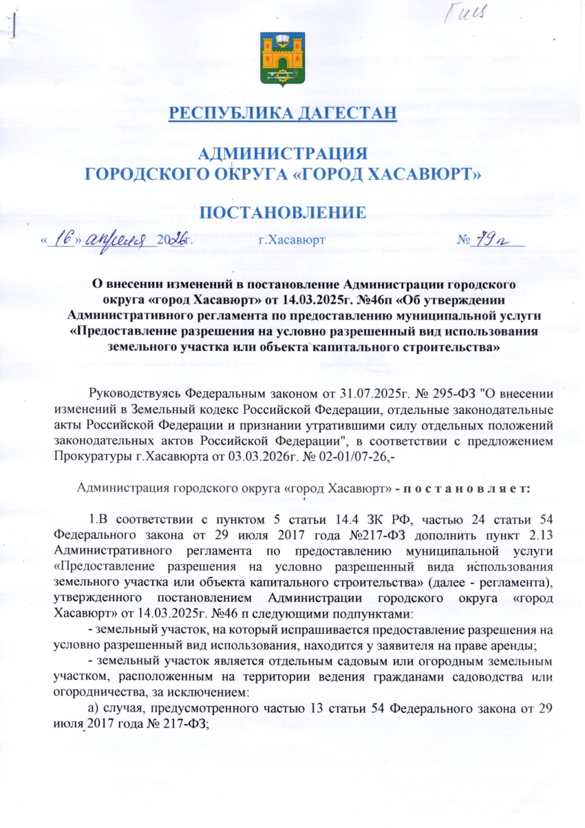 Постановление от 16 апреля 2026 г. № 79 п О внесении изменений в постановление Администрации городского округа "город Хасавюрт" от 14.03.2025г. № 46п "Об утверждении Административного регламента по предоставлению муниципальной услуги "Предоставление разрешения на условно разрешенный вид использования земельного участка или объекта капитального строительства"