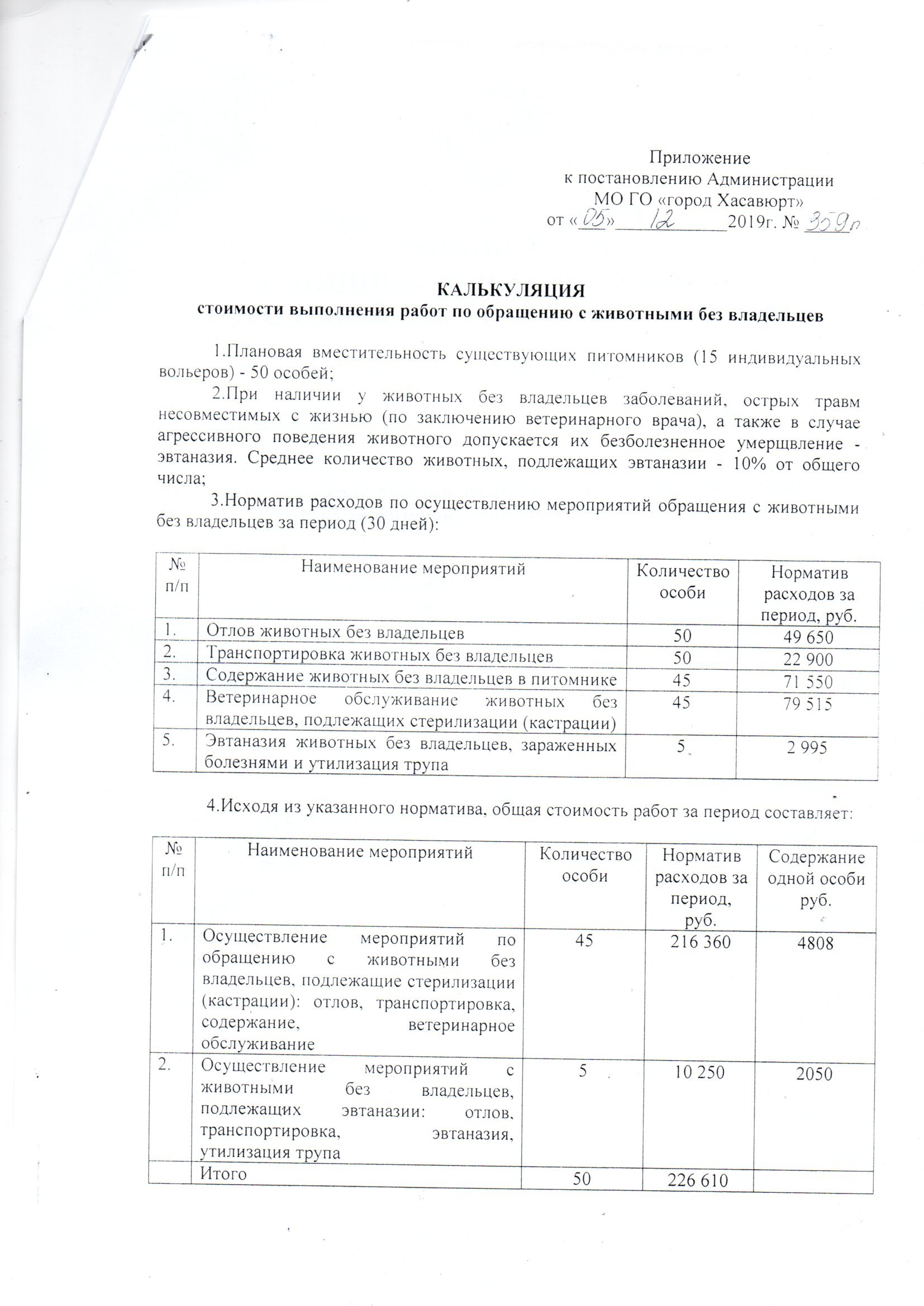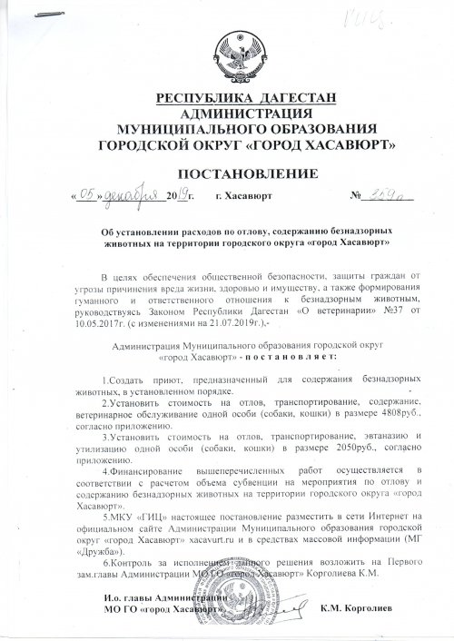 Постановление №359п от 5 декабря 2019 г. об установлении расходов по отлову, содержанию безнадзорных животных на территории городского округа "город Хасавюрт"